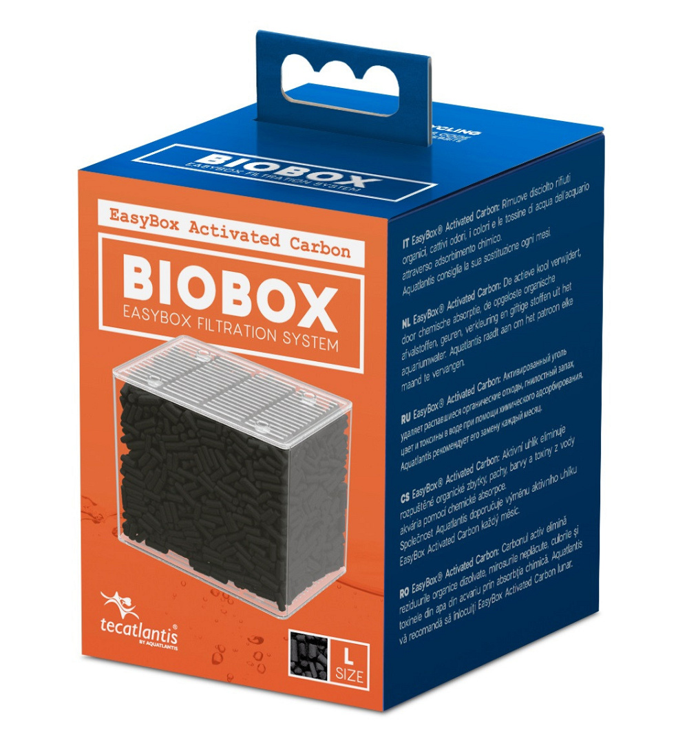 Aquatlantis Easybox Activated Carbon bestaat uit actieve kool. Het verwijdert opgelost organisch afval, slechte geuren, kleuren en giftige stoffen uit het aquariumwater door middel van chemische absorptie.