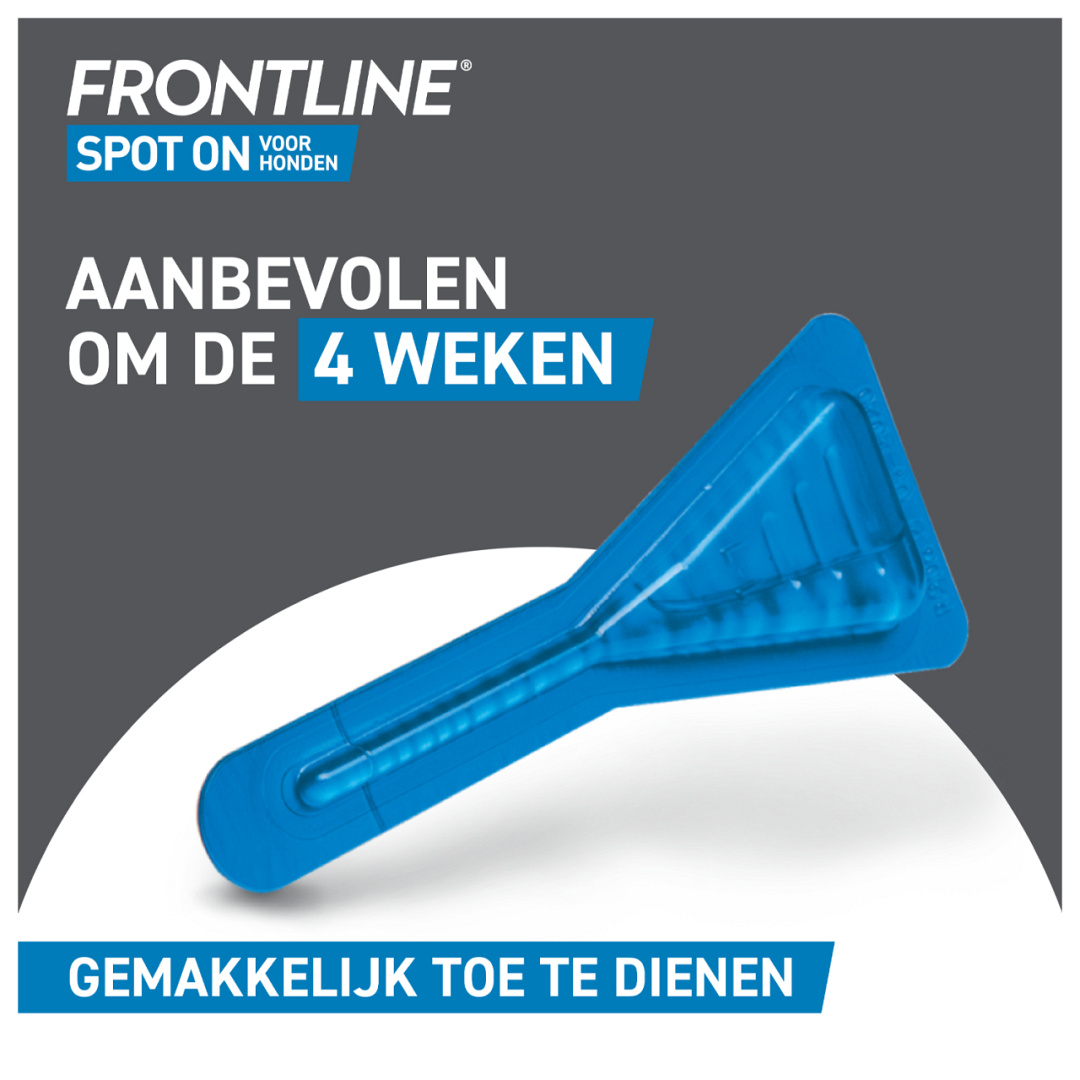 Frontline Spot On is een gemakkelijk aan te brengen vloeistof die jouw huisdier beschermt tegen teken en vlooien. De pipet met de vloeistof dien je tijdens de behandeling volledig leeg te drukken op de huid tussen de schouderbladen. De vloeistof zal zich verspreiden over de huid. Spot on voor honden kan gebruikt worden als onderdeel van een behandeling tegen vlooienallergie.