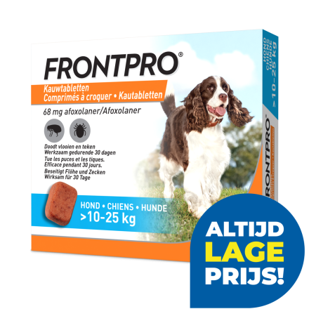1 smakelijke kauwtablet beschermt je hond voor maar liefst 30 dagen en doodt vlooien voordat ze eitjes kunnen leggen. FRONTPRO is zeer makkelijk te geven, met of zonder eten. Van de makers van FRONTLINE.