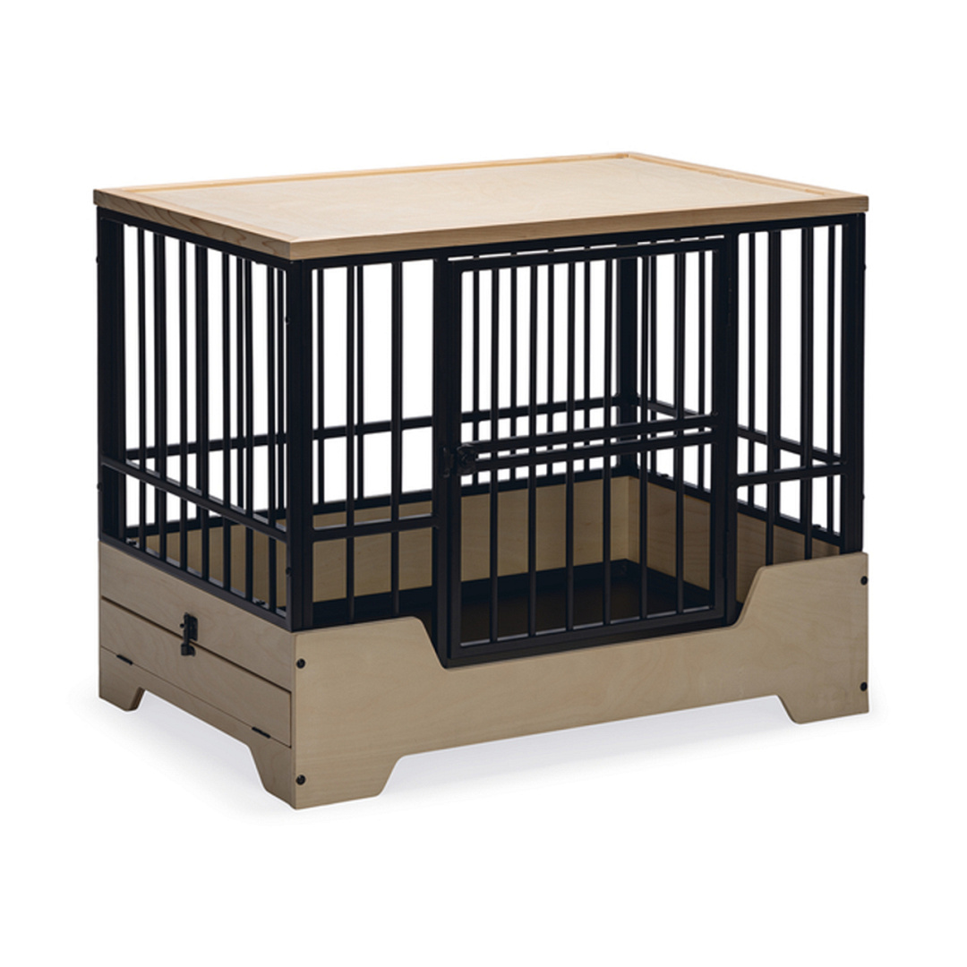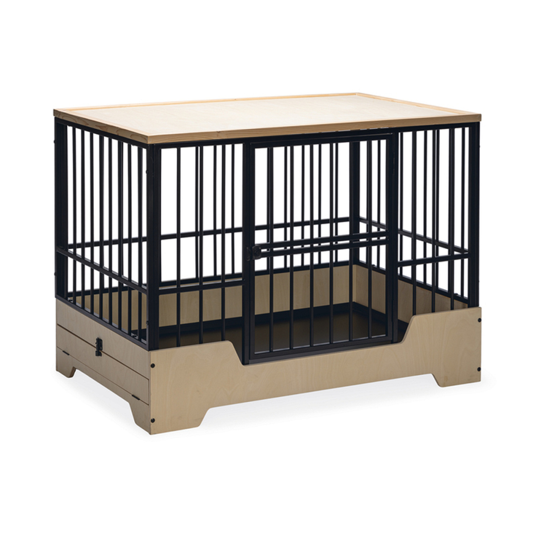 Geef jouw hond een prachtige eigen veilige omgeving die ook nog eens mooi staat binnen jouw interieur met deze Designed by Lotte hondenbench Quirine. De bench heeft een stevig metalen frame en een licht houten onder- en bovenkant. Daarnaast is de bench voorzien van een verhoogde instap en een deur aan de voorkant met een draaisluiting.Bovendien beschikt de bench over een zwarte, uitneembare lade, gemaakt van metaal. Deze lade zit verstopt achter het houten klapframe. Door toevoeging van de lade, maak je de bench schoon in een handomdraai.