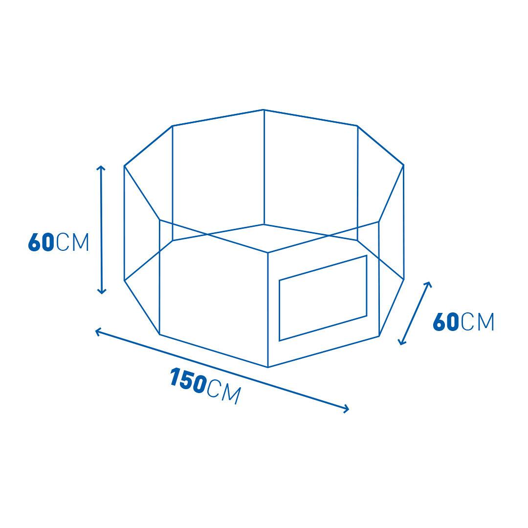 De puppyren van Duvo+ bestaat uit sterk traliewerk en heeft een optimaal formaat dat voldoende ruimte en comfort voorziet voor zowel puppy's als kleine honden. De verplaatsbare puppyren is snel en gemakkelijk te monteren en kan zowel binnen als buiten gebruikt worden. Een praktisch handvat zorgt voor een gemakkelijk transport. Acht haringen houden de puppyren op zijn plaats bij buitengebruik. Inclusief een op maat gemaakt net om te vermijden dat jouw dier de puppyren via de bovenzijde kan ontglippen.