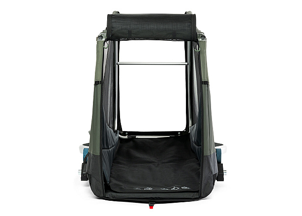 - Optimale ventilatie: de voor-, zij- en achterkant van de fietskar zijn voorzien van gaaspanelen voor een uitstekende ventilatie. Naast het zonnedak, kan ook het voorpaneel volledig worden open geritst.