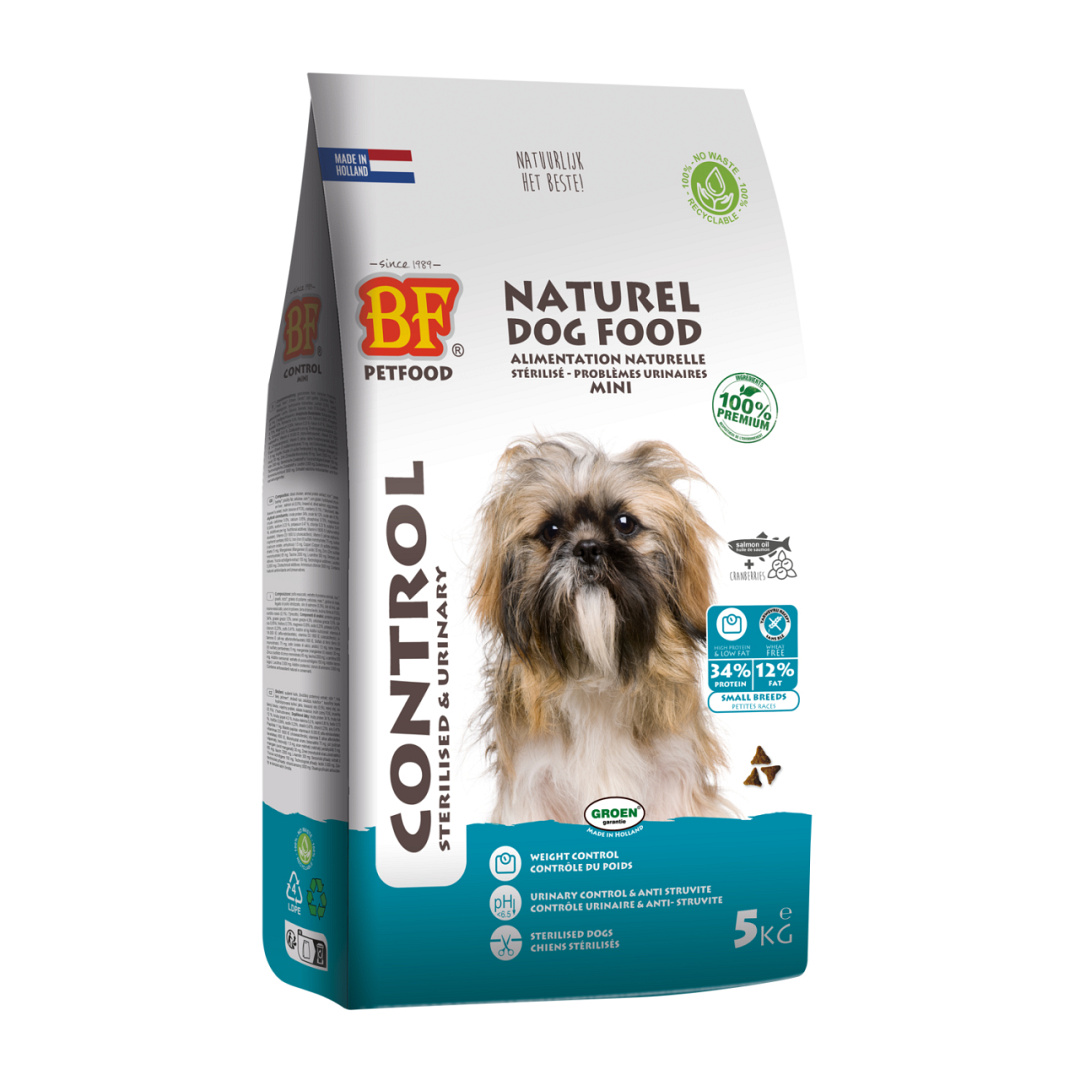 BF Petfood control mini is hoogwaardige volledige smaakvolle premium hondenvoeding voor volwassen honden van kleine rassen, ter ondersteuning van urinewegen (blaasgruis/stenen/struviet) en bij overgewicht (bijv. sterilisatie). Met diverse dierlijke eiwitten. Optimale brokgrootte, -vorm en -structuur. Beperkt caloriegehalte en een aangepaste verhouding mineralen. Helpt de pH van de urine te regelen en kan helpen bij het verminderen van struvietsteenvorming. Ondersteunt de urinewegen, huid en vacht, gebit en helpt het gewicht te behouden of te verminderen. Beperkt geur en volume van de ontlasting.