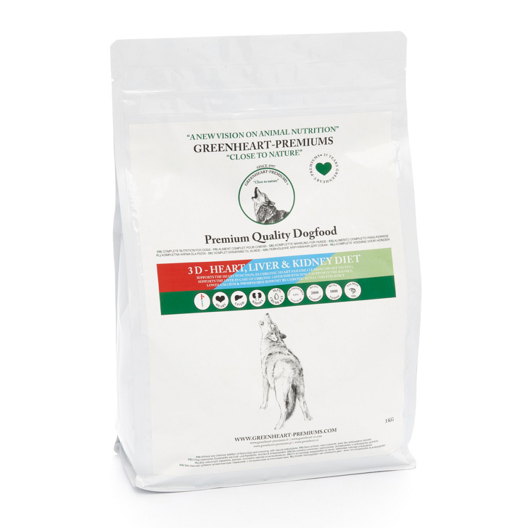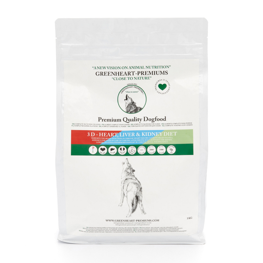 Greenheart 3D Heart, Liver & Kidney Diet hondenvoer is speciaal ontwikkeld voor honden die lijden aan hart-, nier- of leverfalen. Vette visoliën hebben positief effect op het hart. Greenheart 3D Heart, Liver & Kidney Diet werkt bloeddrukverlagend. Rijk aan L-Carnitine voor transport en verbranden van vetten, laag in eiwit, fosfor en wei ten behoeve van de nieren. Greenheart 3D Heart, Liver & Kidney Diet brokken bevatten 14,5% eiwit en 16,5% vet.