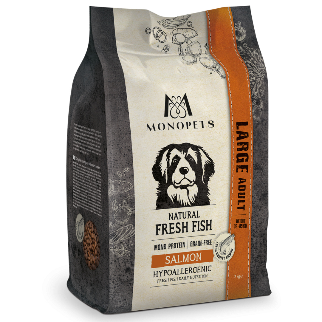 Monopets hypoallergeen Fresh Fish Large Adult Zalm is een smaakvol graanvrij hondenvoer op basis van één dierlijke eiwitbron. Deze natuurlijke voeding bevat zorgvuldig geselecteerde ingrediënten om het risico van allergische reacties tot een minimum te beperken. Het product is gemaakt zonder granen en zit boordevol groenten en fruit, zoals zoete aardappel en appel. Waardevolle vezels uit prebiotica en natuurlijke bronnen ondersteunen de gezondheid van de darmen, en essentiële vetzuren zorgen voor een glanzende vacht en gezonde huid.
