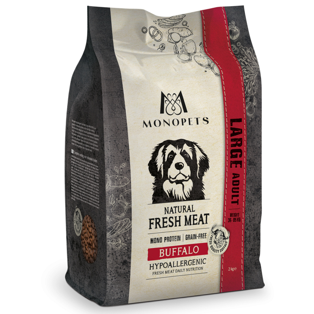 Monopets hypoallergeen Fresh Meat Large Adult Buffel is een smaakvol graanvrij hondenvoer op basis van één dierlijke eiwitbron. Deze natuurlijke voeding bevat zorgvuldig geselecteerde ingrediënten om het risico van allergische reacties tot een minimum te beperken. Het product is gemaakt zonder granen en zit boordevol groenten en fruit, zoals zoete aardappel en appel. Waardevolle vezels uit prebiotica en natuurlijke bronnen ondersteunen de gezondheid van de darmen, en essentiële vetzuren zorgen voor een glanzende vacht en gezonde huid.