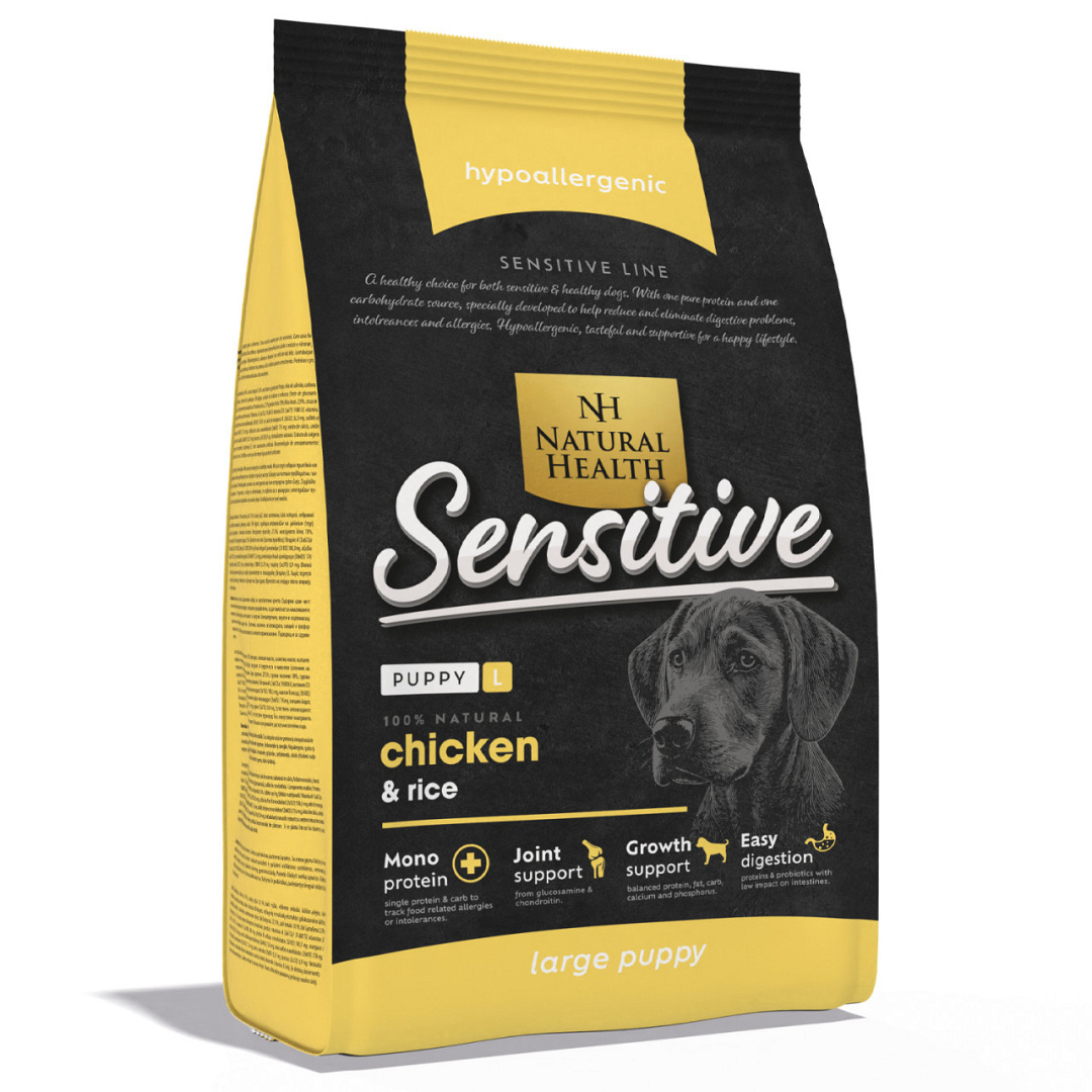 Natural Health Puppy L Sensitive Chicken & Rice is een voeding met slechts één eiwitbron en daarmee uitermate geschikt als hypoallergeen voer of uitsluitdieet.