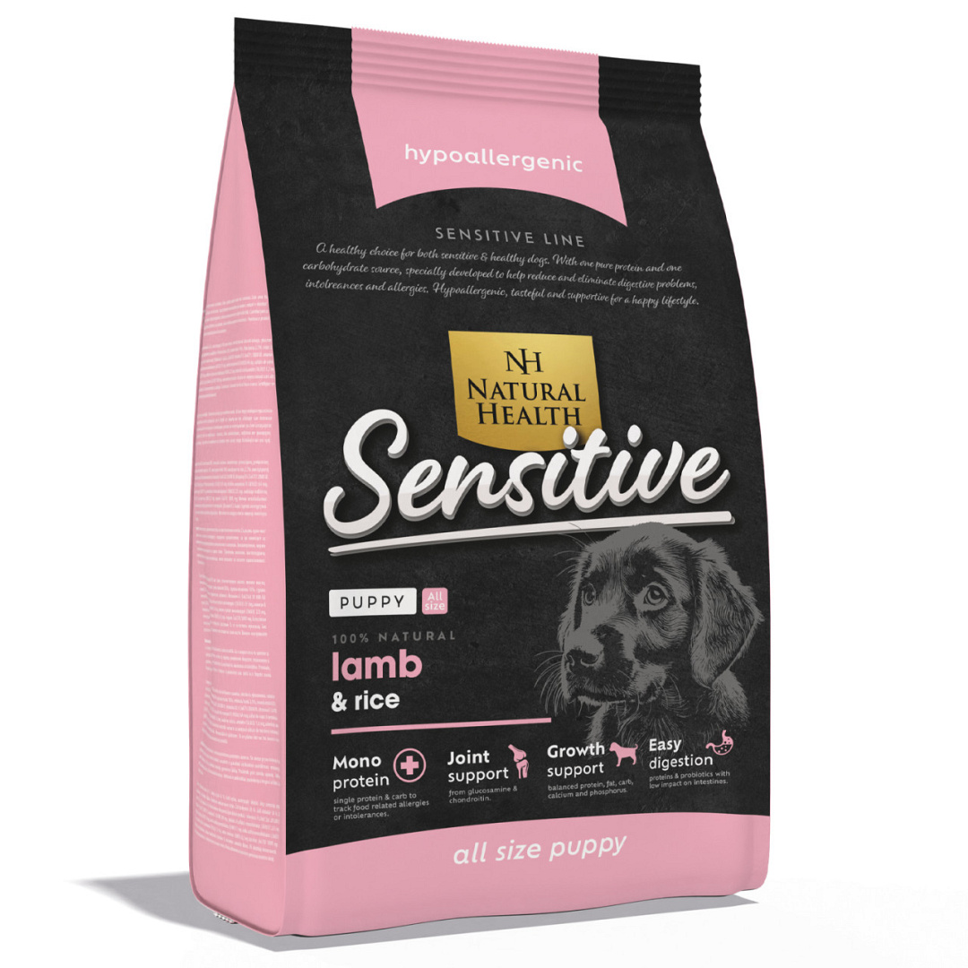 Natural Health Puppy Sensitive Lamb & Rice is een voeding met slechts één eiwitbron en daarmee uitermate geschikt als hypoallergeen voer of uitsluitdieet.