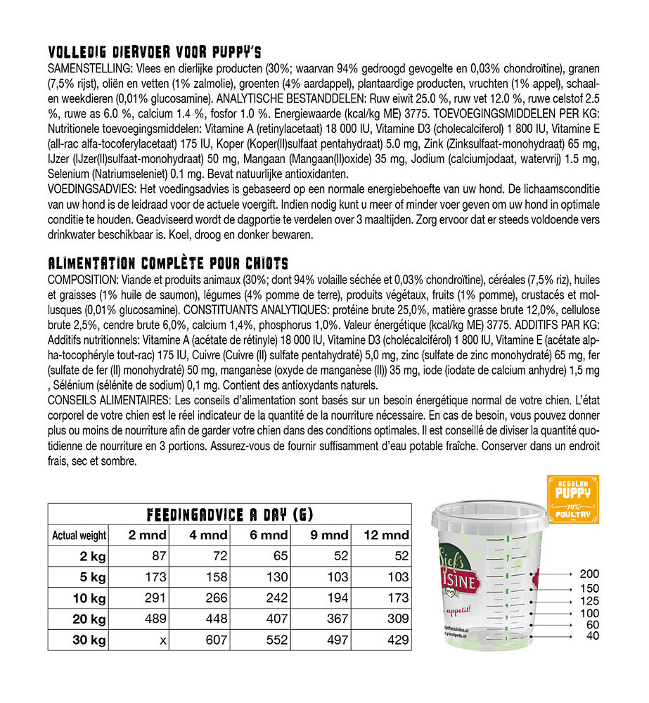 Yamipets Sjef's Cuisine hondenvoer Regular Puppy is een zeer uitgebalanceerde pup voeding voor kleine en middelgrote honden. De hoogwaardige eiwit-combinatie zorgt voor een evenwichtige groei van elke pup, en draagt bij aan een goed werkend immuunsysteem en gezonde opbouw van de gewrichten.