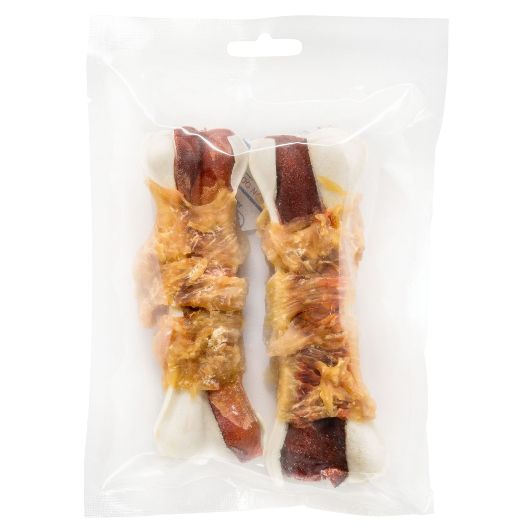 Combinatie van een stevige kern van gedroogde runderhuid, omwikkeld met zachte kipfilet.