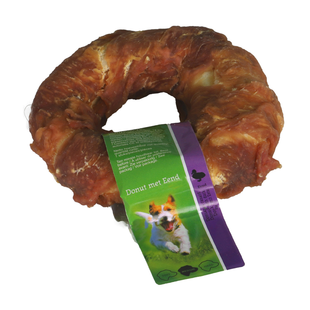 Donuts van witte buffelhuid met eend, deze smakelijke combinatie maakt dit tot een onweerstaanbare hondensnack. Hoge acceptatie, glutenvrij, zonder toevoegingsmiddelen en van premium kwaliteit. Deze donuts van witte buffelhuid met eend is kauwlevel 2 (middel) en daardoor geschikt voor honden met een gemiddelde kauwkracht.
