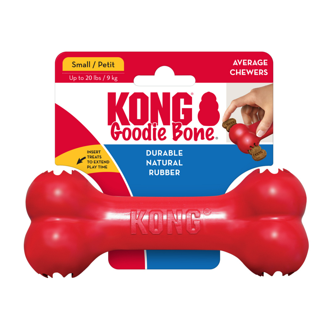 Het Kong Goodie Bone kauwspeeltje is hét antwoord voor honden die dol zijn op de klassieke botvorm, maar een veilig en sterk rubber speeltje nodig hebben. De uiteinden van de Puppy Goodie Bone hebben onze gepatenteerde Goodie Grippers, voor het volstoppen met Kong Snacks of ander lekkers.