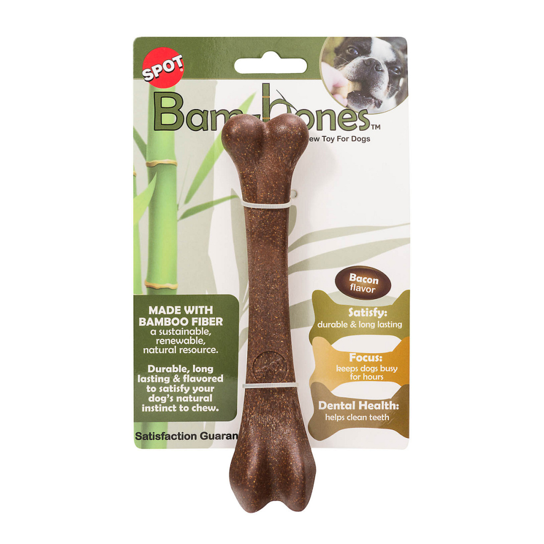 Bam-Bones Bacon is een duurzaam kauwspeeltje van natuurlijke en duurzame bamboevezels! Bam-Bones Bone hondenspeelgoed is gemaakt van duurzame en hernieuwbare bamboevezels en heeft een heerlijke kip- of baconsmaak waar honden dol op zijn. Dit duurzame kauwspeeltje is perfect voor gooi- en apporteerspelletjes en kauwen onder toezicht. Dit speeltje is een geweldige manier om honden bezig te houden en verveling te doorbreken. Bovendien helpt het bijten op de harde textuur de tanden en het tandvlees gezond en schoon te houden.