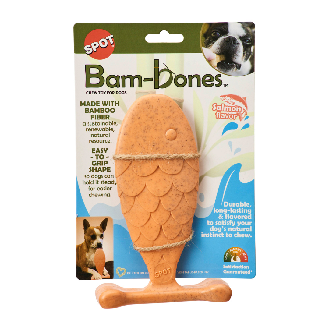Bam-Bones Fish is een duurzaam kauwspeeltje van natuurlijke en duurzame bamboevezels! Bam-Bones met zalmsmaak zijn gemaakt met de kracht van bamboevezels en nylonvezels om een nog duurzamer kauwspeeltje te maken. De unieke vorm maakt het gemakkelijk om het kauwspeeltje op zijn plaats te houden. Voorkomt destructief kauwen terwijl het ruwe oppervlak tandplak en tandsteen helpt bestrijden. Op smaak gebracht met niet-dierlijke ingrediënten. Bam-Bones kauwspeelgoed wordt aanbevolen door dierenartsen.
