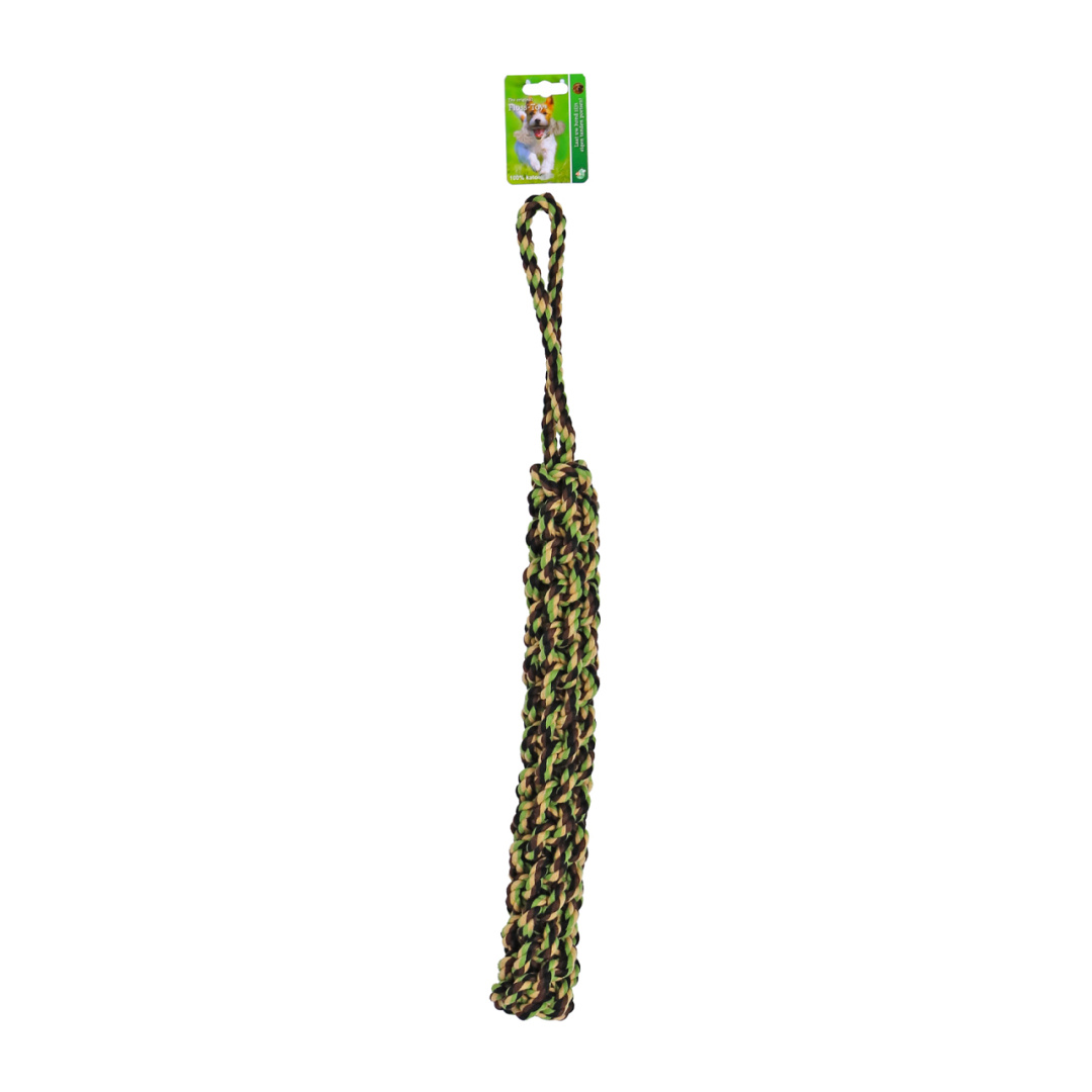 Laat je hond genieten van urenlang speelplezier met de katoenen Touwstick met handvat. Dit speeltje is meer dan alleen een leuk tijdverdrijf, het is ook een geweldige manier om de tanden van jouw hond schoon en gezond te houden. Het stevige katoenen touw en het handige handvat zijn ontworpen voor interactief spelen en bieden tegelijkertijd een effectieve flossende werking. Terwijl jouw hond kauwt en trekt aan het touw, worden tandplak en tandsteen op een natuurlijke manier verwijderd, waardoor zijn gebit fris en gezond blijft. Het duurzame materiaal zorgt ervoor dat dit speeltje bestand is tegen zelfs de meest enthousiaste kauwers, terwijl het handvat zorgt voor een goede grip tijdens het spelen.