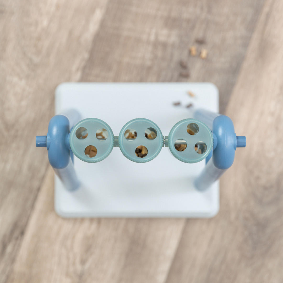 Door de gevulde potjes van de TRIXIE Dog Activity Turn Around om te draaien, vallen er beloningssnoepjes uit.