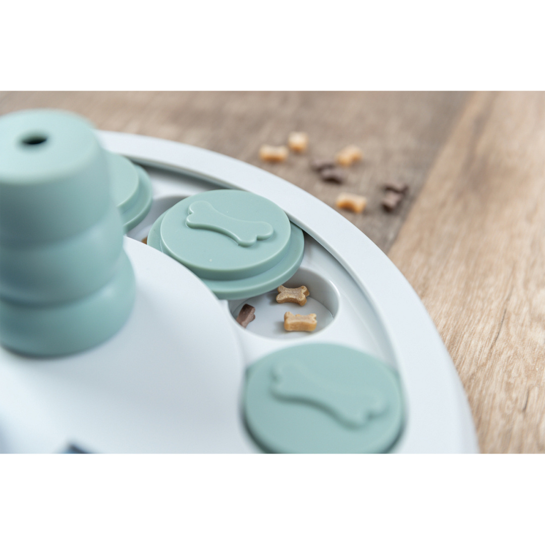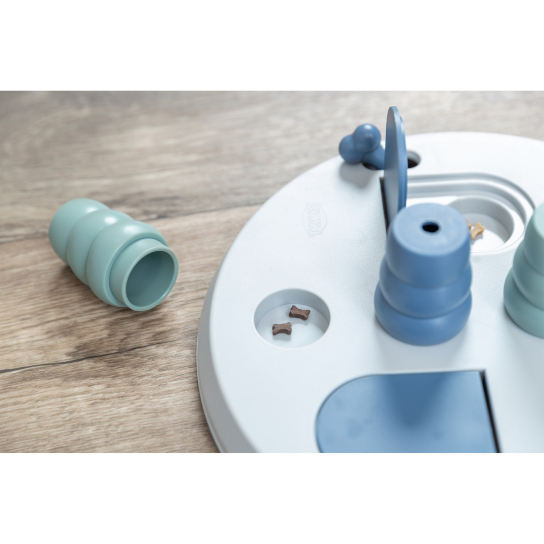 Het Trixie Hondenspeelgoed Dog Activity Flip Board XXL is ideaal om je harige vriend mentaal en fysiek uit te dagen en verveling uit het dagelijkse leven te bannen. Daarbij versterk je de band door samen te spelen. Het bordspel bestaat uit kommetjes die je kunt vullen met snacks van jouw keuze. De deksels moeten dan door je hond opzij worden geduwd of opengeklapt. Daarnaast zijn er drie kegels die je viervoeter met z'n poot of snuit omver moet duwen om bij de gewenste beloningen te komen. Na gebruik kun je het intelligentiespel gewoon in de vaatwasser doen, zodat het klaar is voor een volgend gebruik.