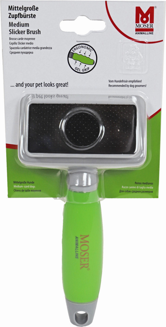 Met de Moser slicker borstel kun je effectief borstelen en vervilting verwijderen. De borstel heeft een ergonomisch handvat en is geschikt voor middelgrote honden.