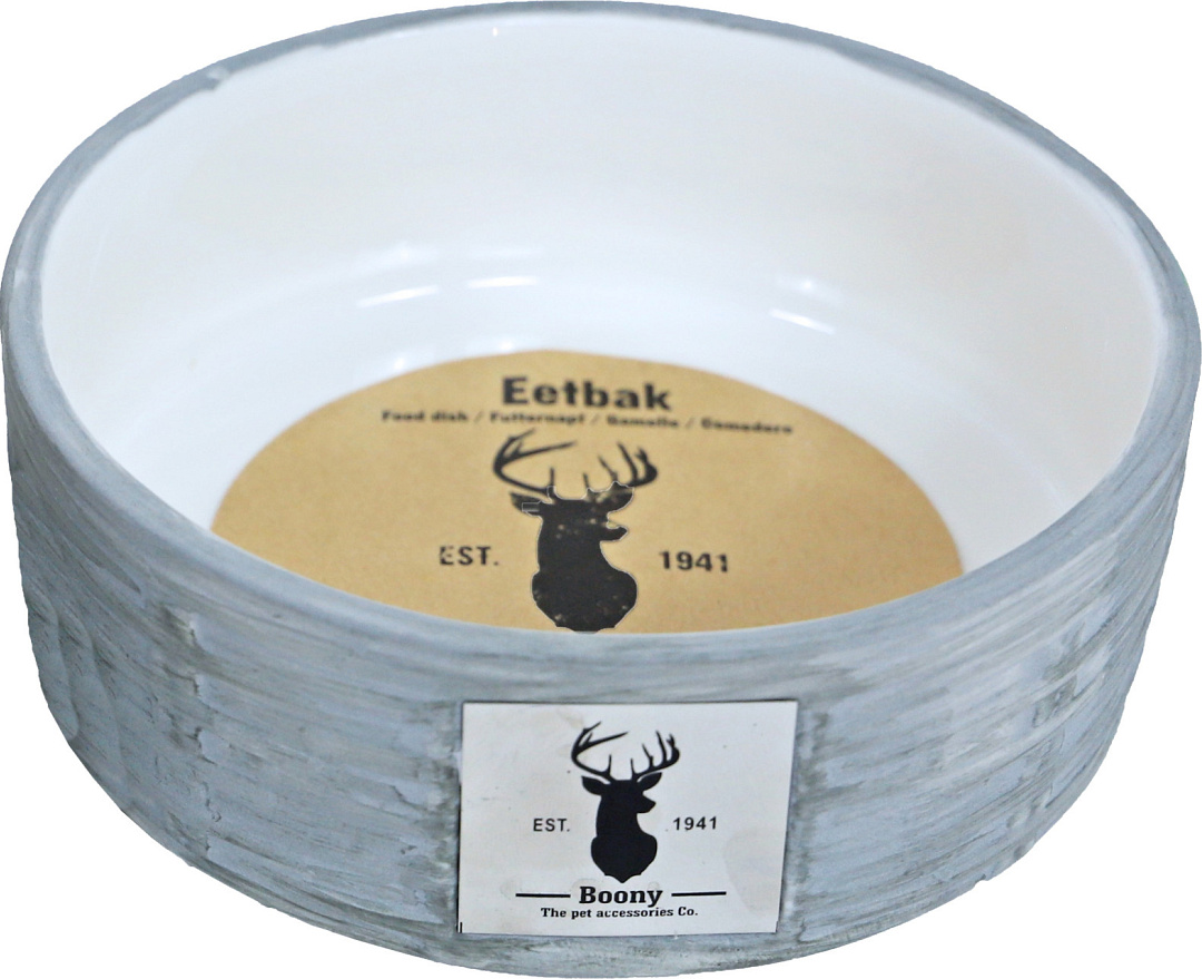 De Boony Est 1941 voerbak steen wicker zal ieder huis nog een stukje stijvoller maken. Deze stenen eetbak is uitgevoerd in de kleur grey en lijkt op een rieten mand.