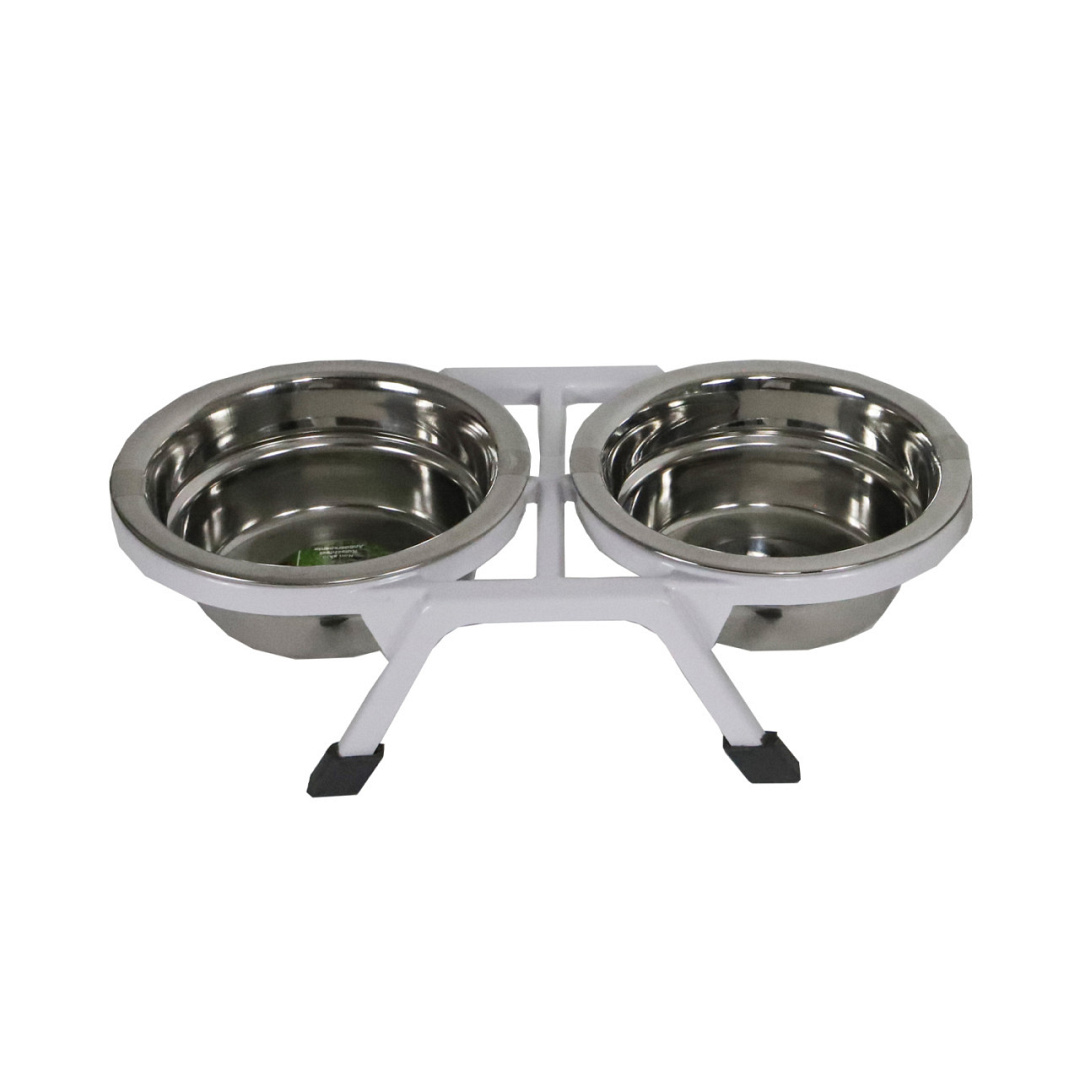 Deze dinerset van kunststof is voorzien van twee rvs bakken. Door de anti slip pootjes blijft deze dinerset perfect op zijn plek staan wanneer deze wordt gebruikt. De rvs bakjes zijn ook voorzien van een rubbere antisliprand, waardoor ze niet rammelen in de plastic houders.