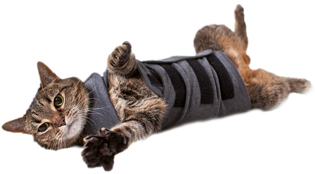 Het Thundershirt is een vest voor de kat dat vrij strak rond het lichaam van de kat zit.