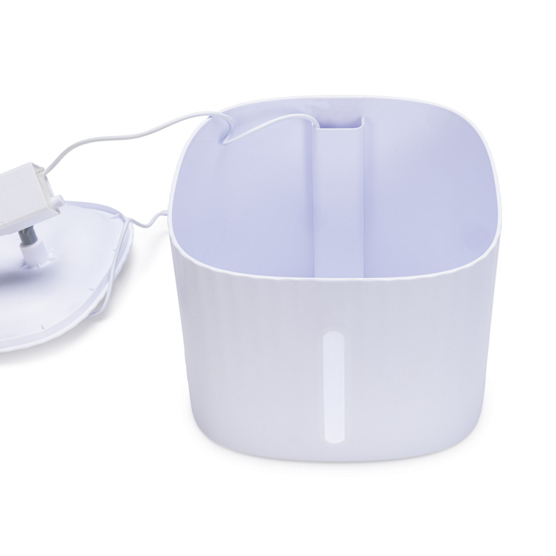 De fontein maakt weinig geluid, is geschikt voor 3 liter water en beschikt over een snoer van 1,2 meter die je via USB kunt aansluiten op de stroom. De sensor aan de voorzijde zal rood branden als het waterniveau te laag is.