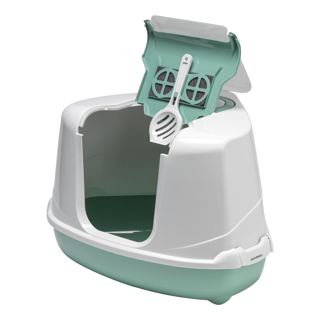 Moderna kattentoilet Flip Corner is een mooi vormgegeven kattentoilet voor in de hoek. De naar boven openklapbare deur zal het dagelijkse schoonmaken van de kattenbak vergemakkelijken. Beschikt over een handvat en een semi-doorschijnende deur voor extra privacy. Gemaakt van premium kwaliteit 100% gerecycled plastic voor langdurig gebruik. Inclusief kattenbakschep.