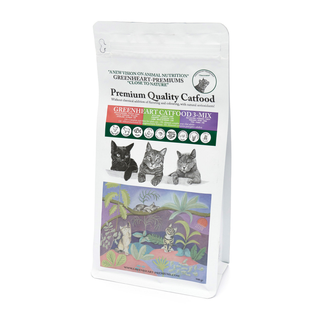 Greenheart catfood 3 mix is kattenvoer speciaal ontwikkeld voor de volwassen kat met een normaal energieniveau. Greenheart catfood 3 mix is een heerlijke mix van Lam, kip en vis, vrij van alle schadelijke gluten. Greenheart catfood 3 mix brokjes bevatten 29% eiwit en 17,5 % vet. Dit unieke product combineert 3 soorten Greenheart brokken met ieder een eigen brok (hartje, rondje, driehoekje). Het combineert Greenheart catfood Lamb & rice, Greenheart catfood Chicken & rice en Greenheart catfood Fish & rice.