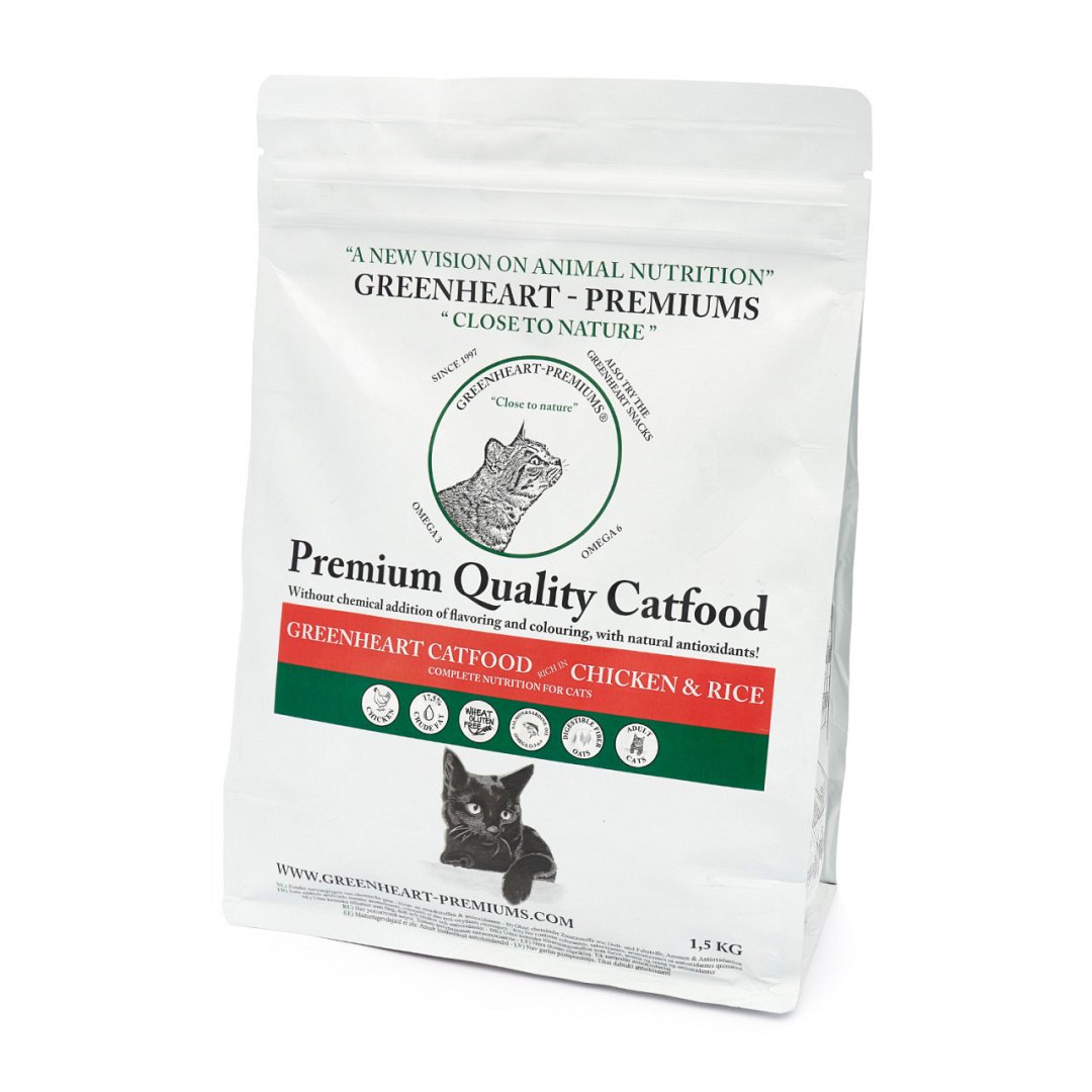 Greenheart catfood Chicken & Rice is kattenvoer, speciaal ontwikkeld voor de volwassen kat. Greenheart catfood Chicken & rice is een complete voeding en is glutenvrij. Greenheart catfood Chicken & rice brokjes bevatten 28,5% eiwit en 17,8% vet. Rijk aan kip. Het heeft een hartvormig brokje. De brokjes worden makkelijke geaccepteerd door de kat.