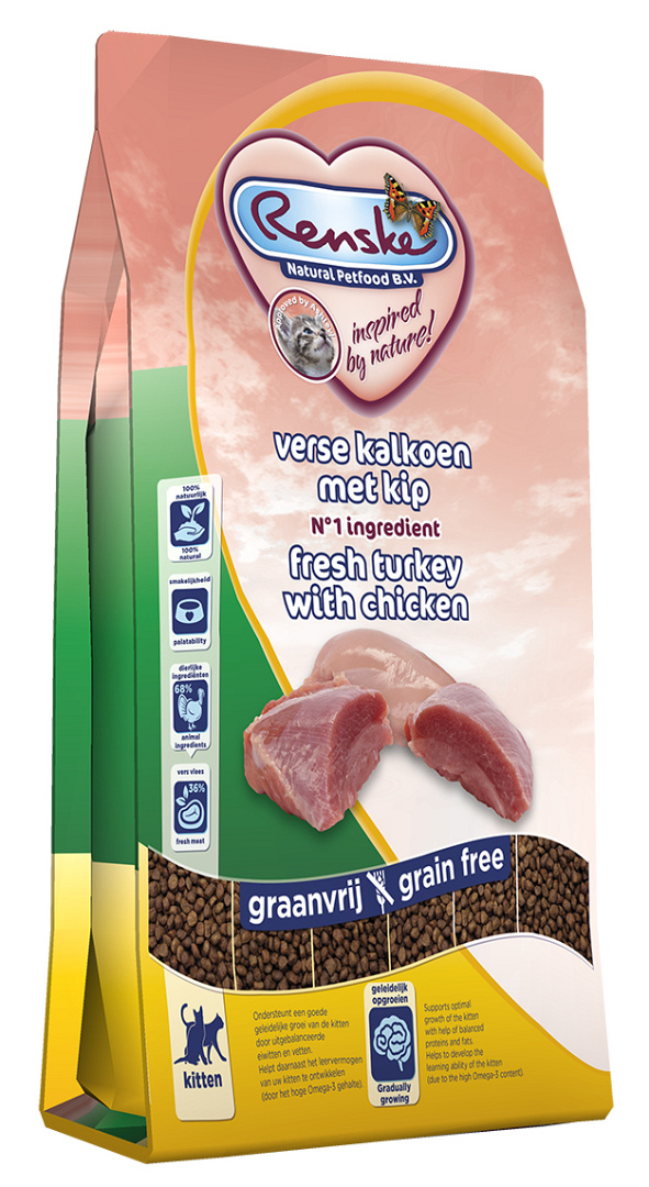 Renske Super Premium kattenvoer kitten kalkoen & kip is een complete, licht verteerbare, graanvrije voeding voor kittens van alle rassen.