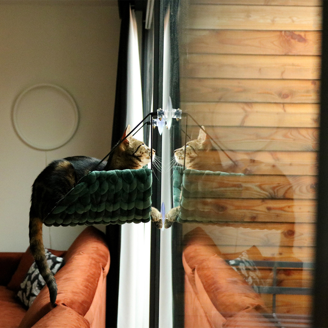 Heerlijke kattenslaapplek voor aan het raam. Zo kan jouw kat alles, binnen en buiten, in de gaten houden.