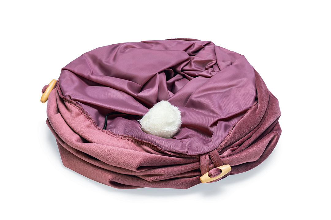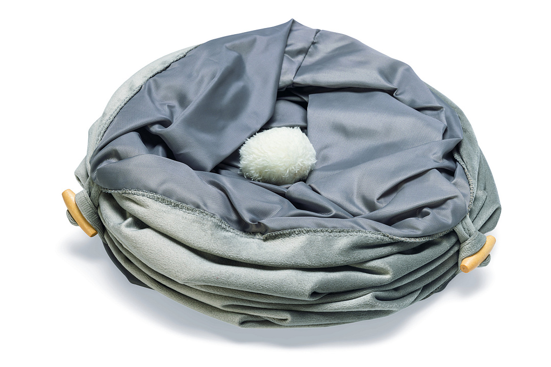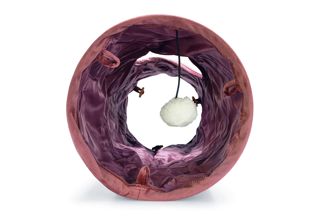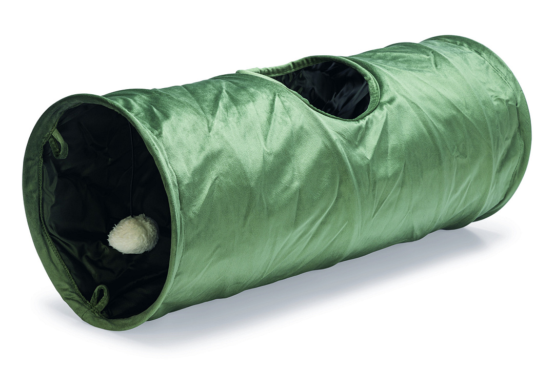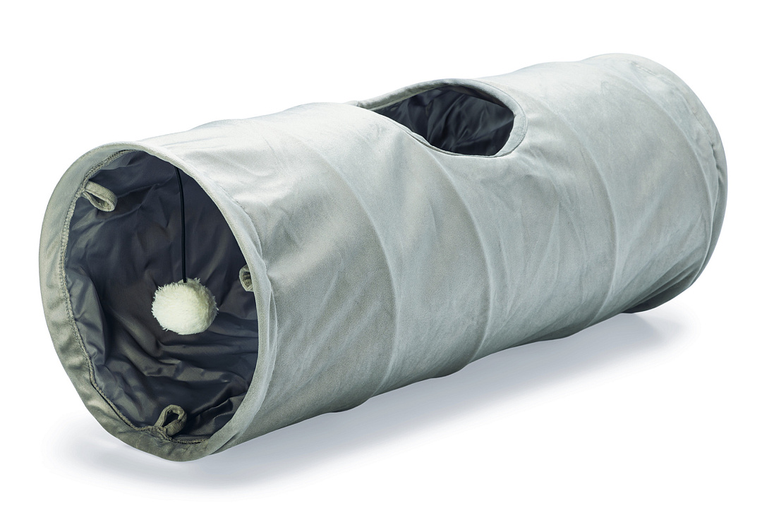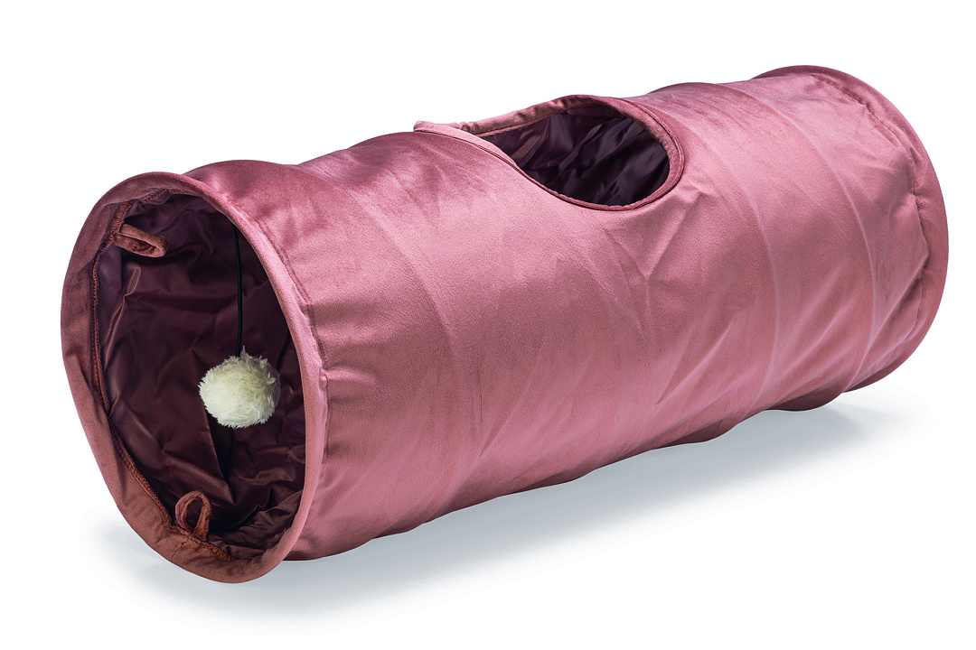 Kattentunnel met velvet stof aan de buitenzijde en metalen ring zodat de tunnel open blijft staan. Kan eenvoudig ingeklapt worden. Inclusief kattenspeeltje.