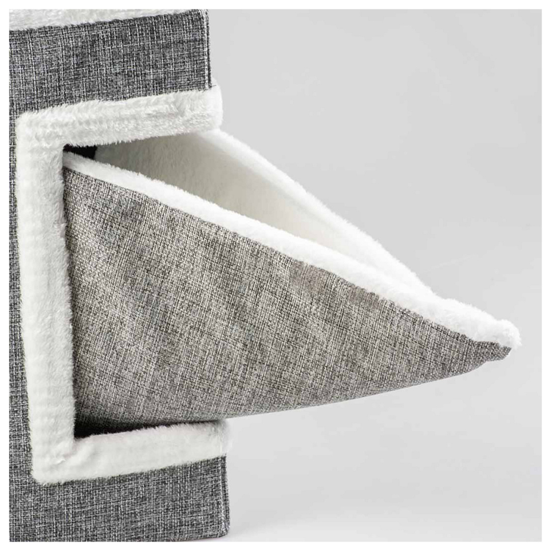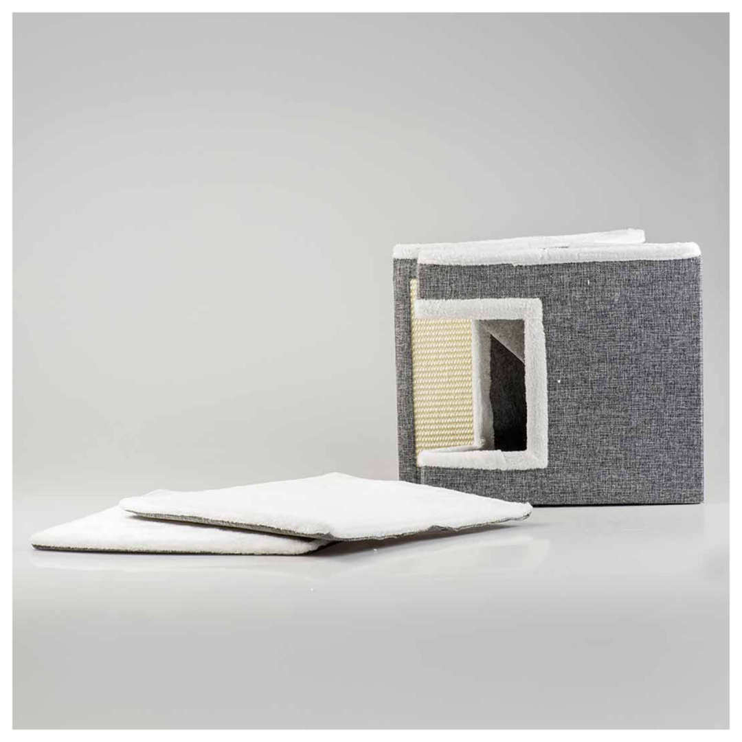 Compact huisje voor je kat. Met 2 ligplaatsen, een sisal krabmat en afgewerkt met pluche.