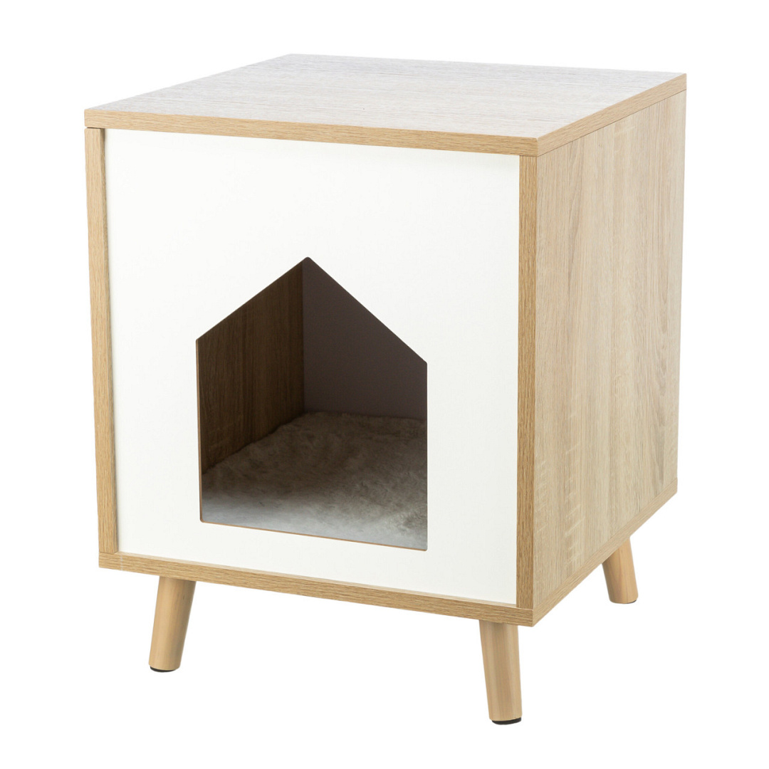 Heerlijk houtlook huisje voor jouw kat, met pluchen kussentje.