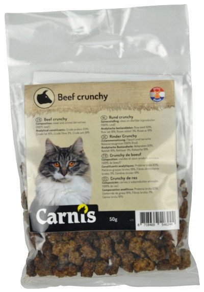 Carnis Rund Crunchy is een krokante snack gemaakt van 100% rundvlees. Een smakelijk tussendoortje voor je kat.
