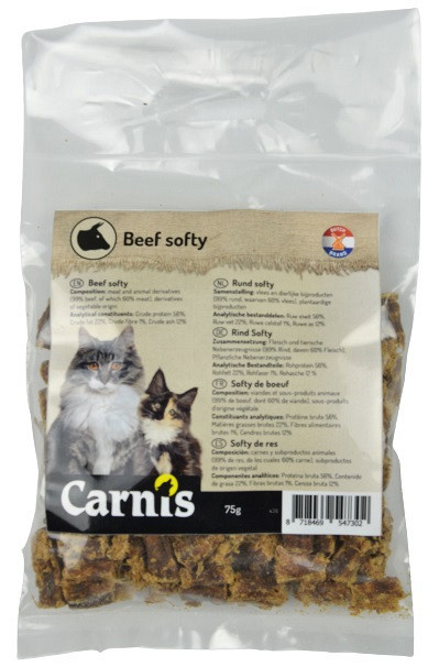 Carnis Rund Softy bestaat uit zachte stukjes vlees, op basis van rund. Een smakelijk tussendoortje om je kat mee te verwennen.