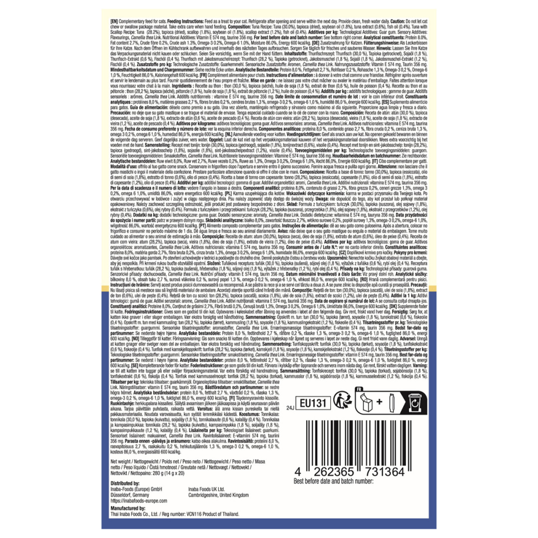 Inaba Churu is gemaakt met lekkere ingrediënten van hoge kwaliteit, waaronder gekweekte kip en/of natuurlijke wildgevangen tonijn. Elke heerlijke, romige Churu tube bevat 88% vocht en slechts zes calorieën (een tiende van de calorieën van traditionele droge kattensnoepjes), waardoor het een snack is die je met een goed gevoel kunt voeren.