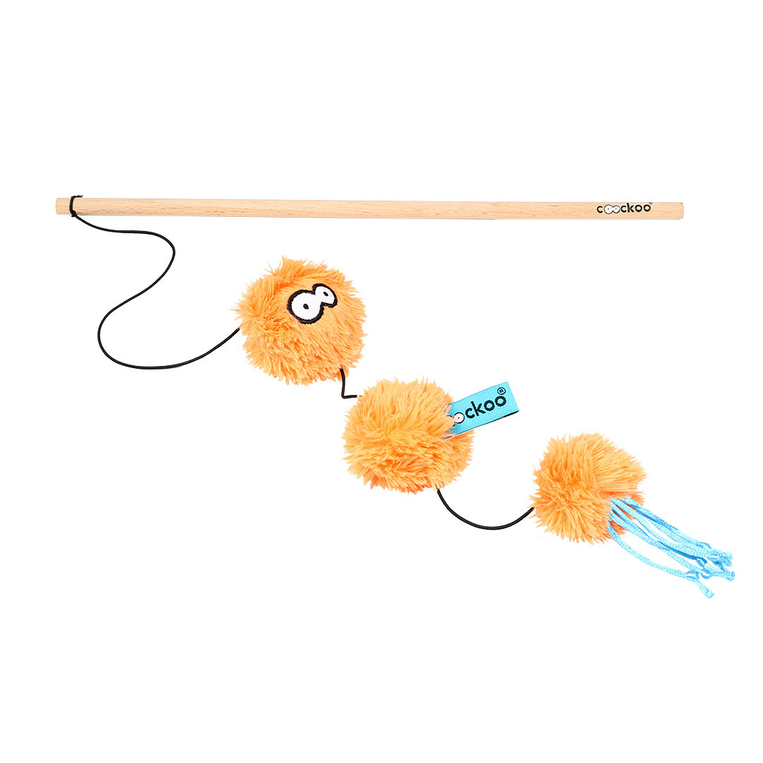 Coockoo kattenhengel Tony is een kattenhengel met drie pluizige pompoms. Door de hengel te bewegen gaan de pompoms alle kanten op. Het onderste balletje heeft een staart met speelse touwtjes en door het geheel zit een zwart elastisch touw heen.