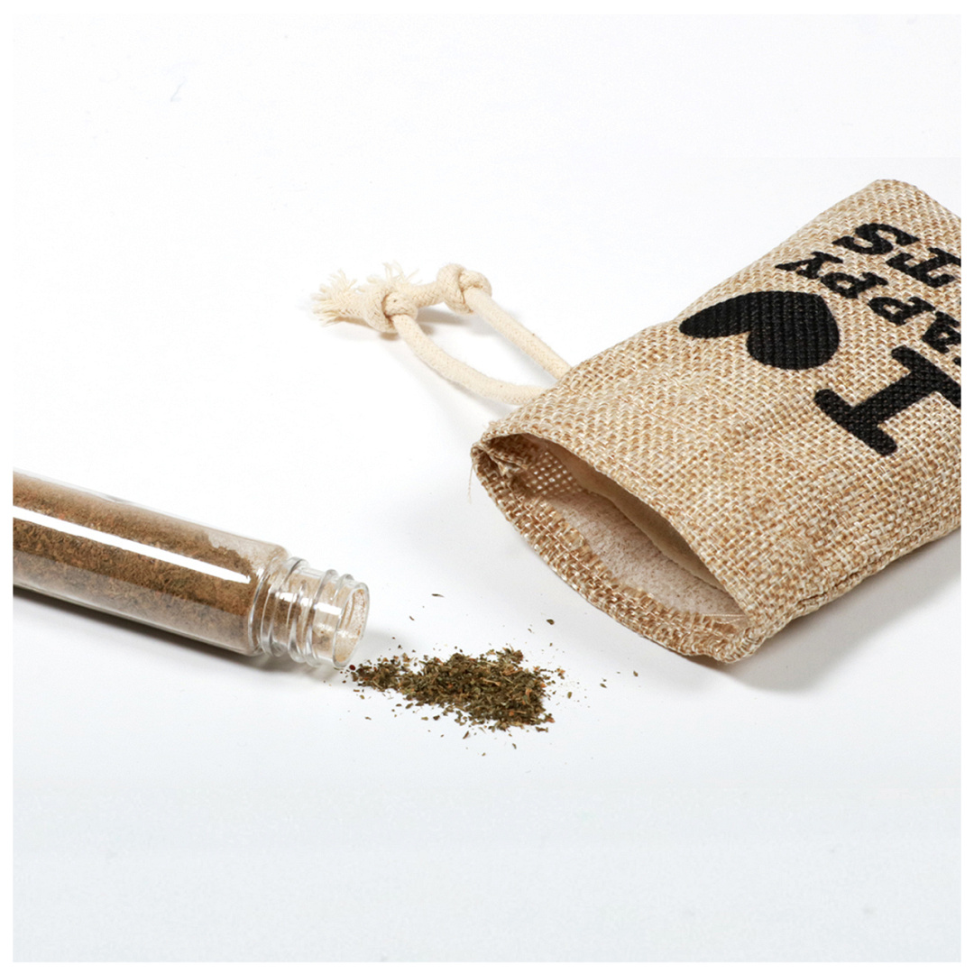 De I love happy cats buidel is een handig zakje van D&D Home gecombineerd met de fantastische Happy Cats kruidenmix van drie krachtige kruiden: gedroogde valeriaanwortel, kattenkruid en matatabi.