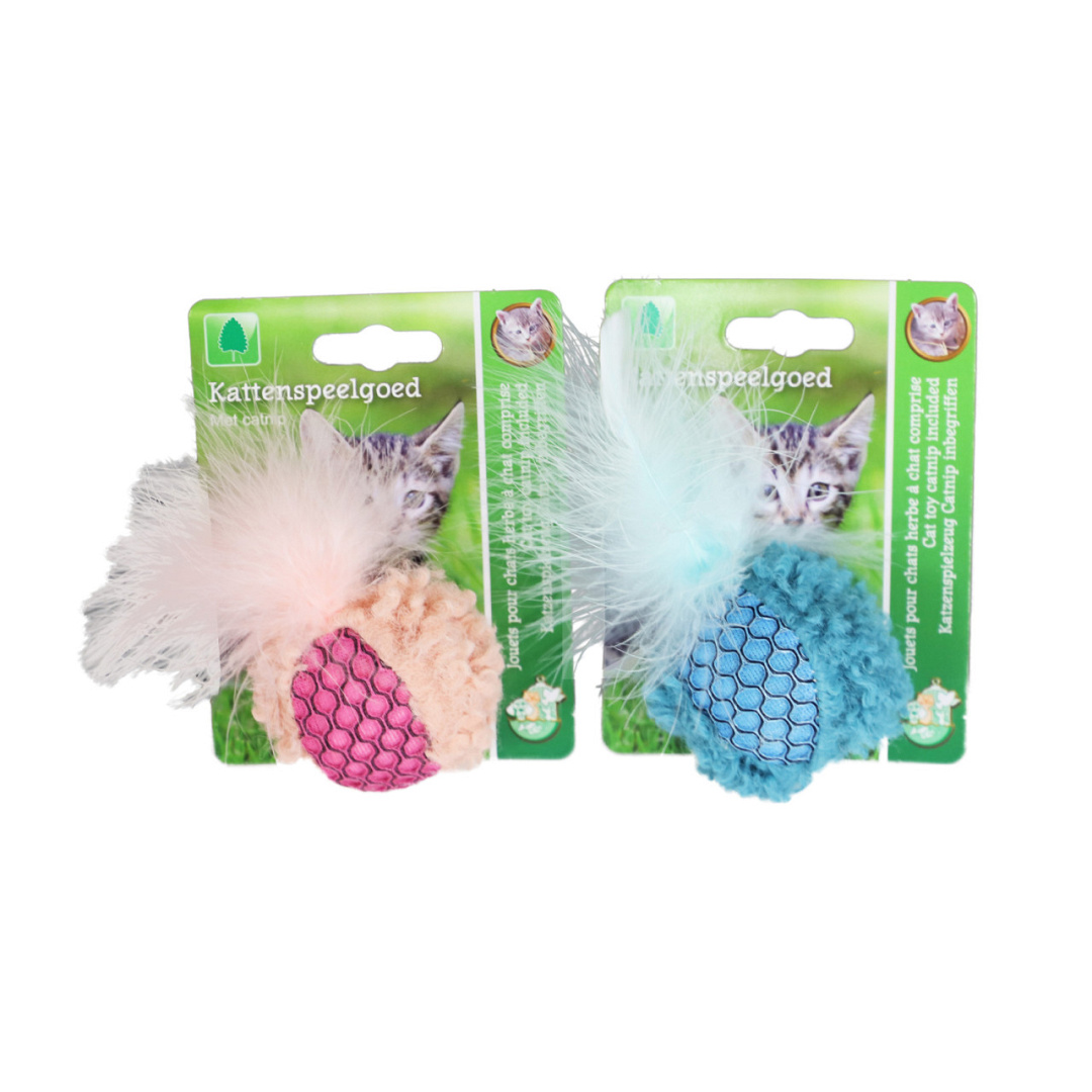 Pluchen bal voor jouw kat, met veren en catnip voor extra speelplezier. Kleur niet vrij te kiezen.