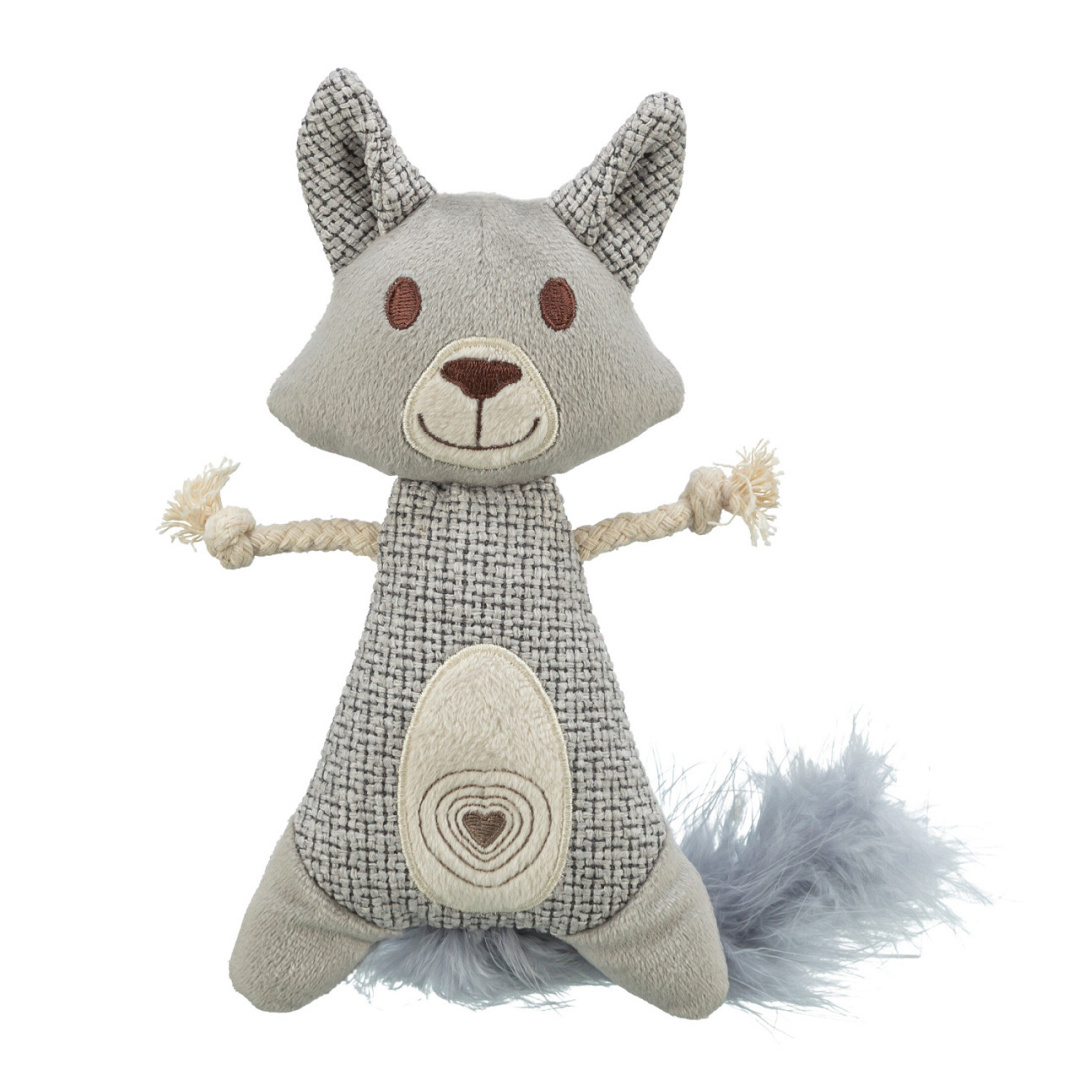 Pluchen knuffel met armpjes van touw en een verenstaart. Met kattenkruid voor extra aantrekkingskracht.