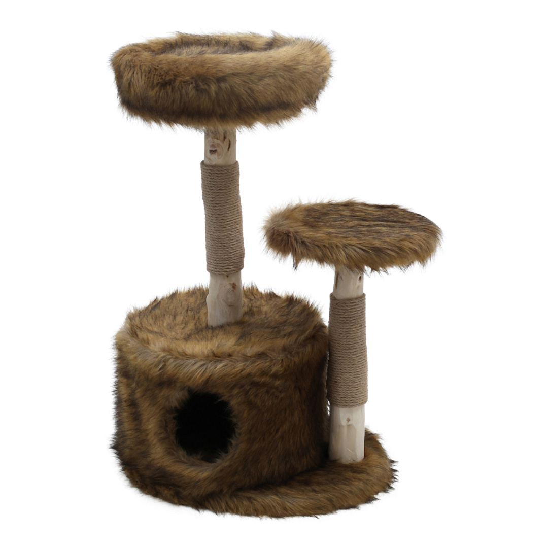 Uniek krabmeubel van natuurlijke houten stammen, met twee pluchen plateaus en een fijn holletje.