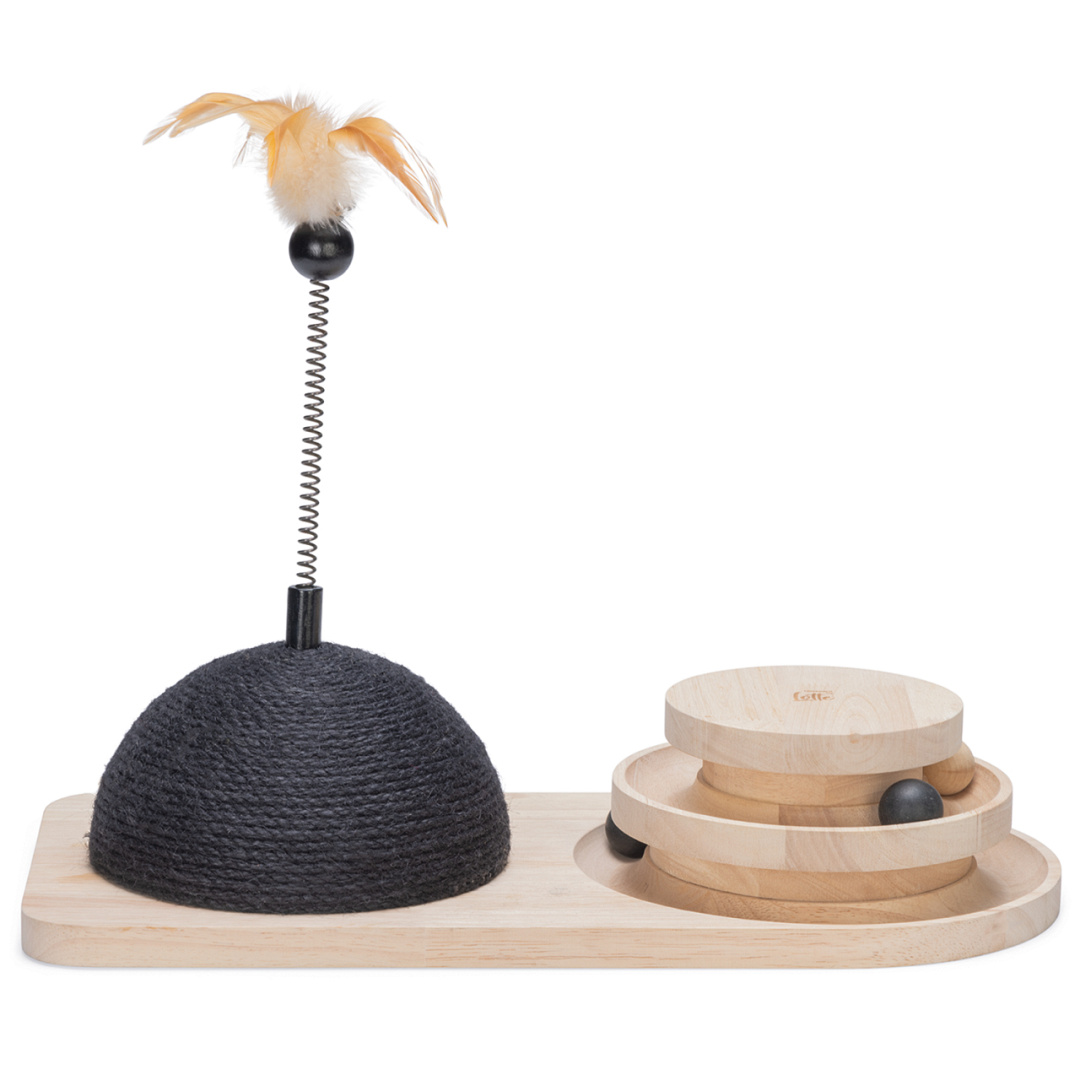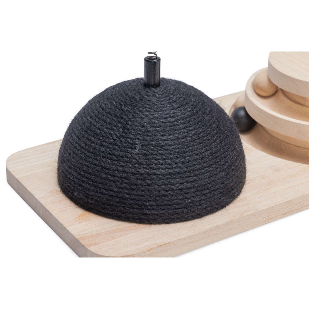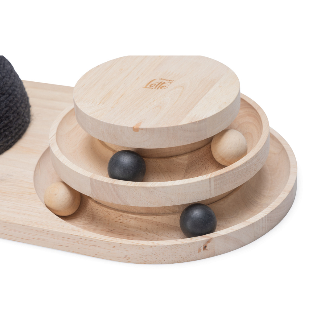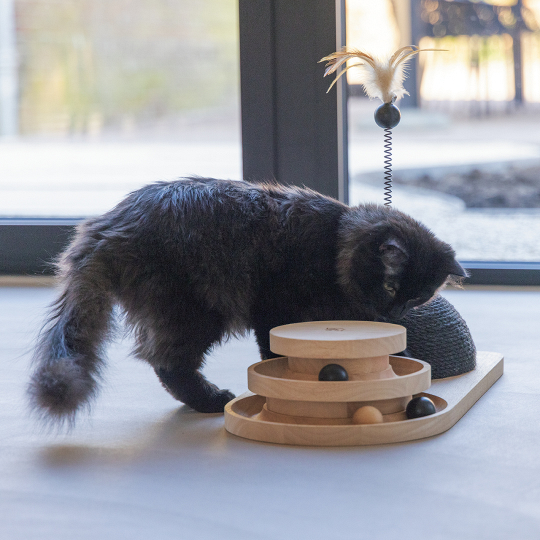In de speeltoren, gemaakt van rubberhout, bevinden zich twee verdiepingen waar houten balletjes in verstopt zitten. Zodra jouw kat met zijn of haar pootjes tegen de balletjes aantikt, zullen ze gaan rollen in de sleuf. Is jouw kat snel genoeg om het balletje weer te stoppen?