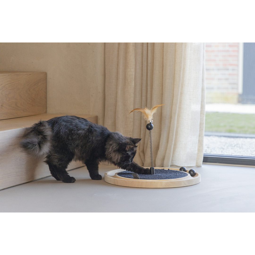 Laat jouw kat genieten van dit prachtige Designed by Lotte krabspeeltje Idah. Dit stijlvolle kattenspeeltje is gemaakt van rubberhout en beschikt over diverse speelelementen. Het speeltje bevat een sisalmat in het midden, waar jouw kat aan kan krabben. Uniek aan deze sisalmat is dat deze opgetild kan worden, zodat je het meegeleverde zakje kattenkruid eronder kunt verstoppen. Reageert jouw kat positief op kattenkruid? Dan zal hij of zij nog enthousiaster spelen! De springveer in het midden, met houten balletje en veer, is perfect om op te jagen. Ook de houten balletjes in de zijkant bewegen in de sleuf zodra jouw kat ze met zijn of haar pootjes aantikt. Om je vloer te beschermen tegen krassen worden er stickers van vilt meegeleverd.