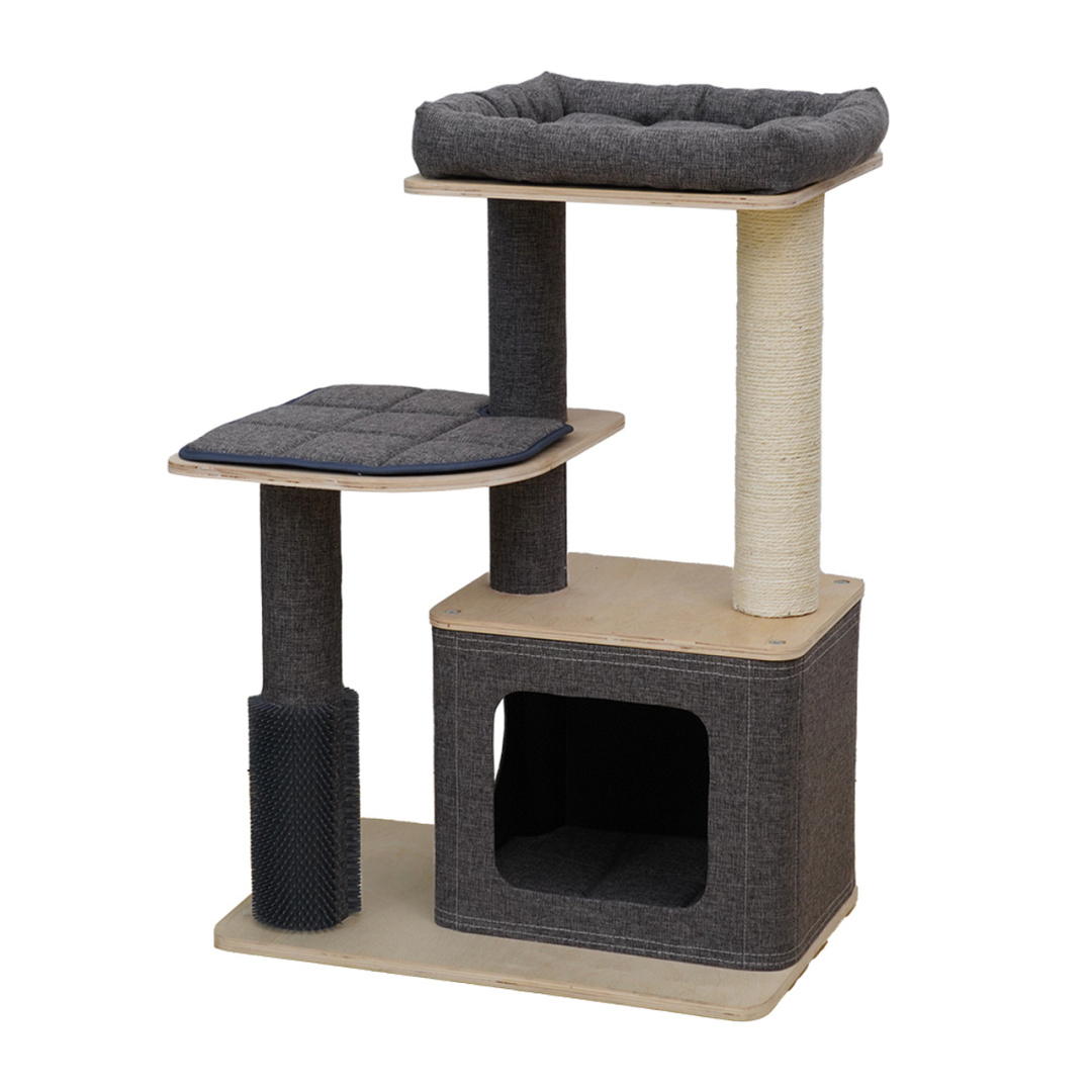 Voor katten is een krabmeubel zoals de EBI Tapei erg belangrijk om hun nagels te verzorgen en territorium te markeren. De EBI Tapei is gemaakt uit berkenmultiplex en is bekleed met een donkergrijze meubelstof. De robuuste krabpaal is omwikkeld met sterk sisal. De Tapei heeft een kattenhuisje met twee openingen, deze is zeer geschikt als schuil- en rustplaats voor jouw kat, maar ook als speelhuisje! Het comfortabele mandje bovenop kan zowel dienen als uitkijkplaats en als slaapplaats. Een van de palen is voorzien een groomer, zodat de kat zichzelf op elk moment kan verzorgen.