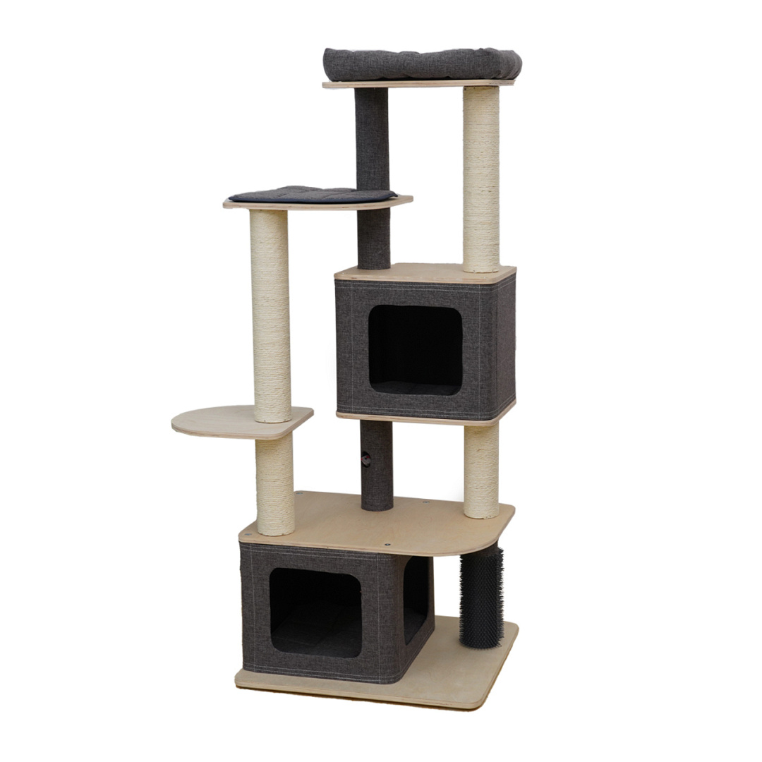 Robuust krabmeubel met twee huisjes, een comfortabel mandje bovenop en een speelmuisje voor extra speelplezier. Afm. 58 x 48 x 142 cm.