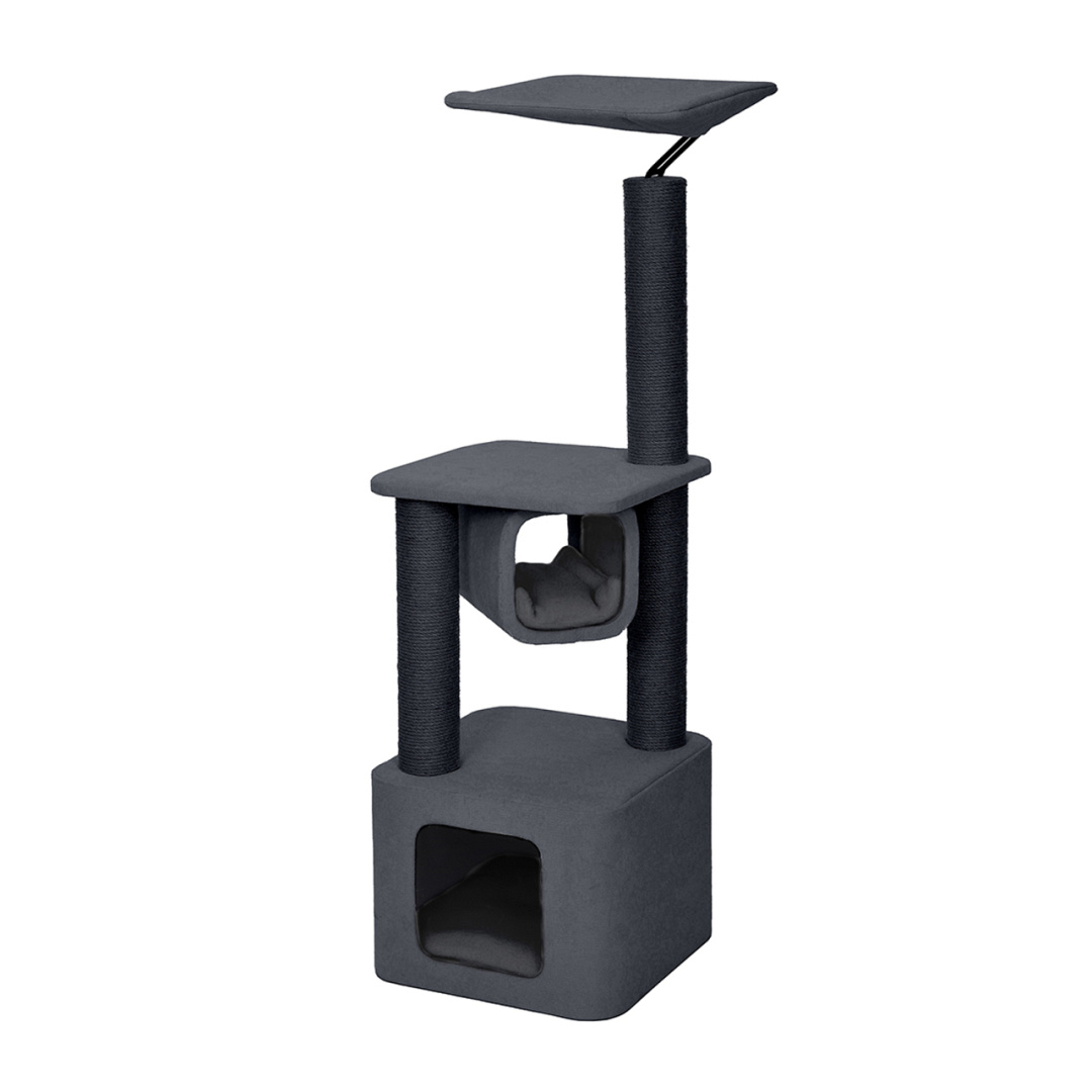 Minimalistische krabpaal in zenstijl met meerdere slaapplekken en comfortabele hangmat bovenop. Afm. 37 x 37 x 121 cm.