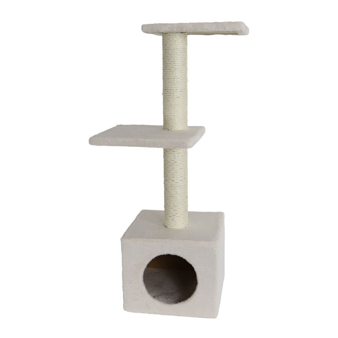 Krabmeubel met stevige stammen, een huisje en verschillende ligplaatsen. Zo kan jouw kat alles goed in de gaten houden.