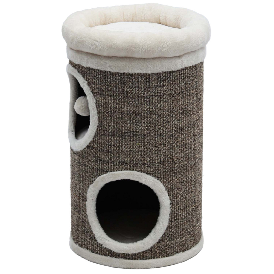 Krabton met 2 gaten en 3 comfortabele slaapplaatsen. Aan de buitenkant bekleed met sisal om de nagels aan te scherpen. Afm. Ø 38 x 66 cm
