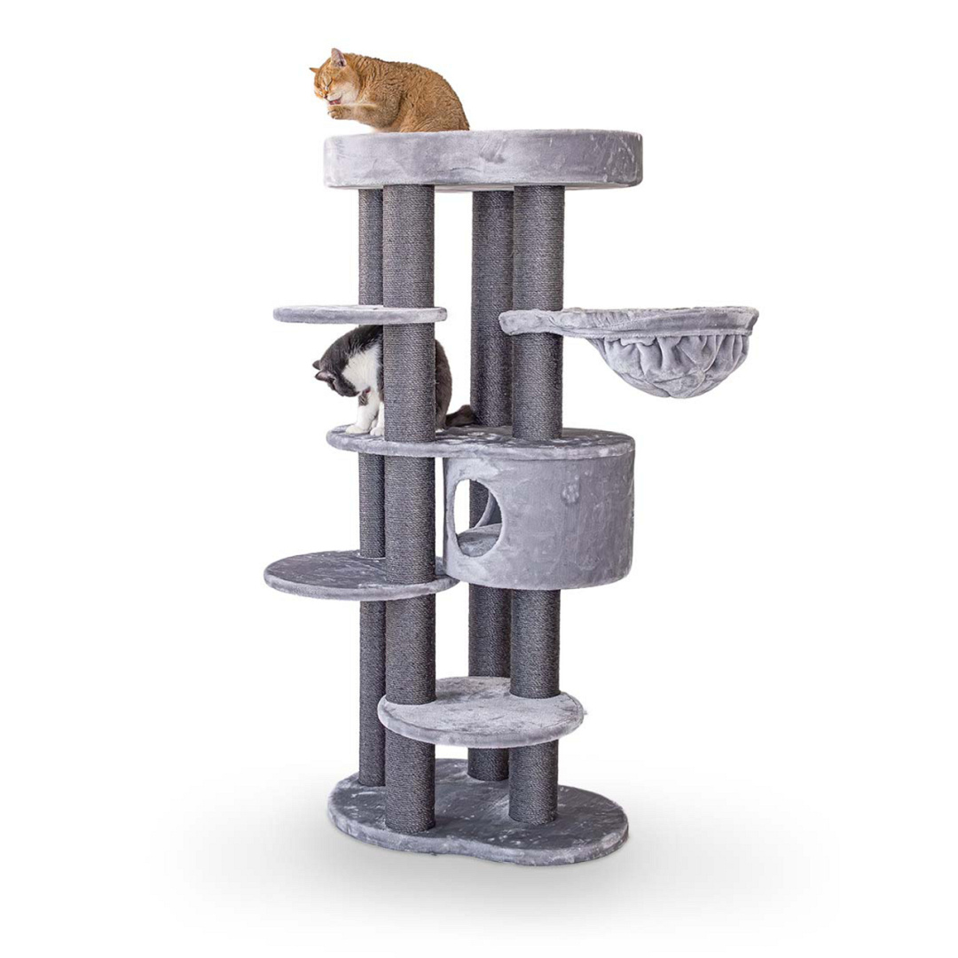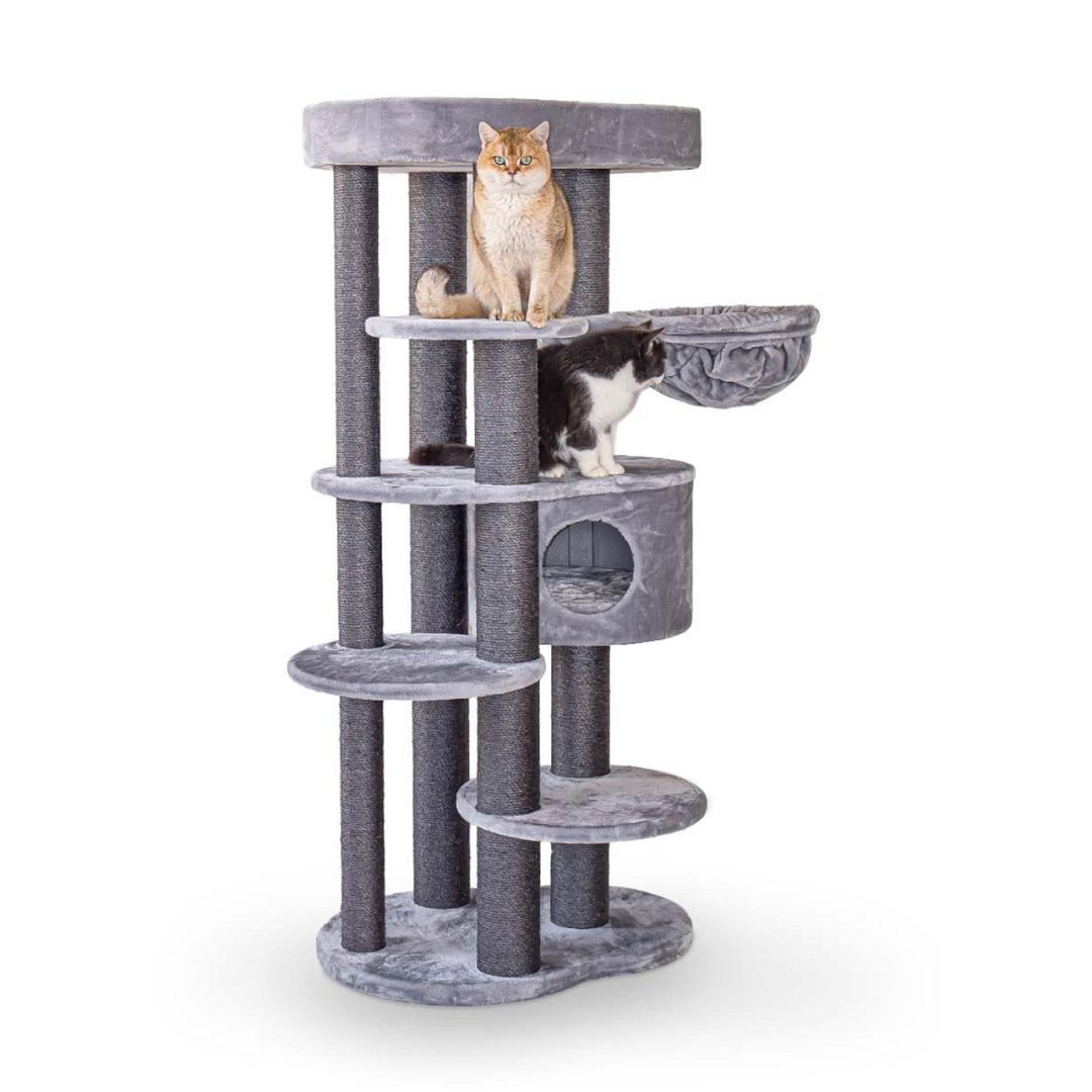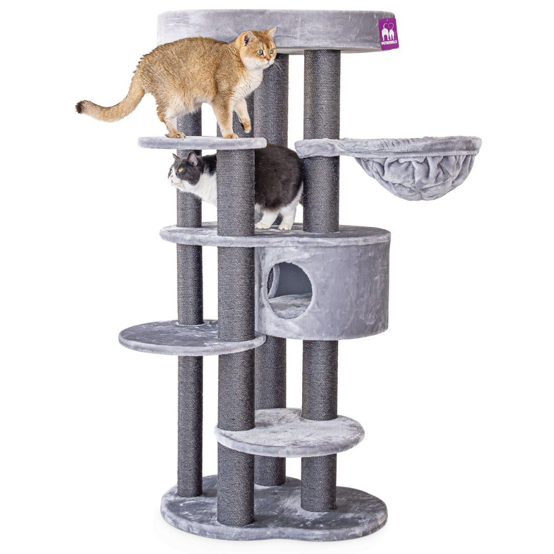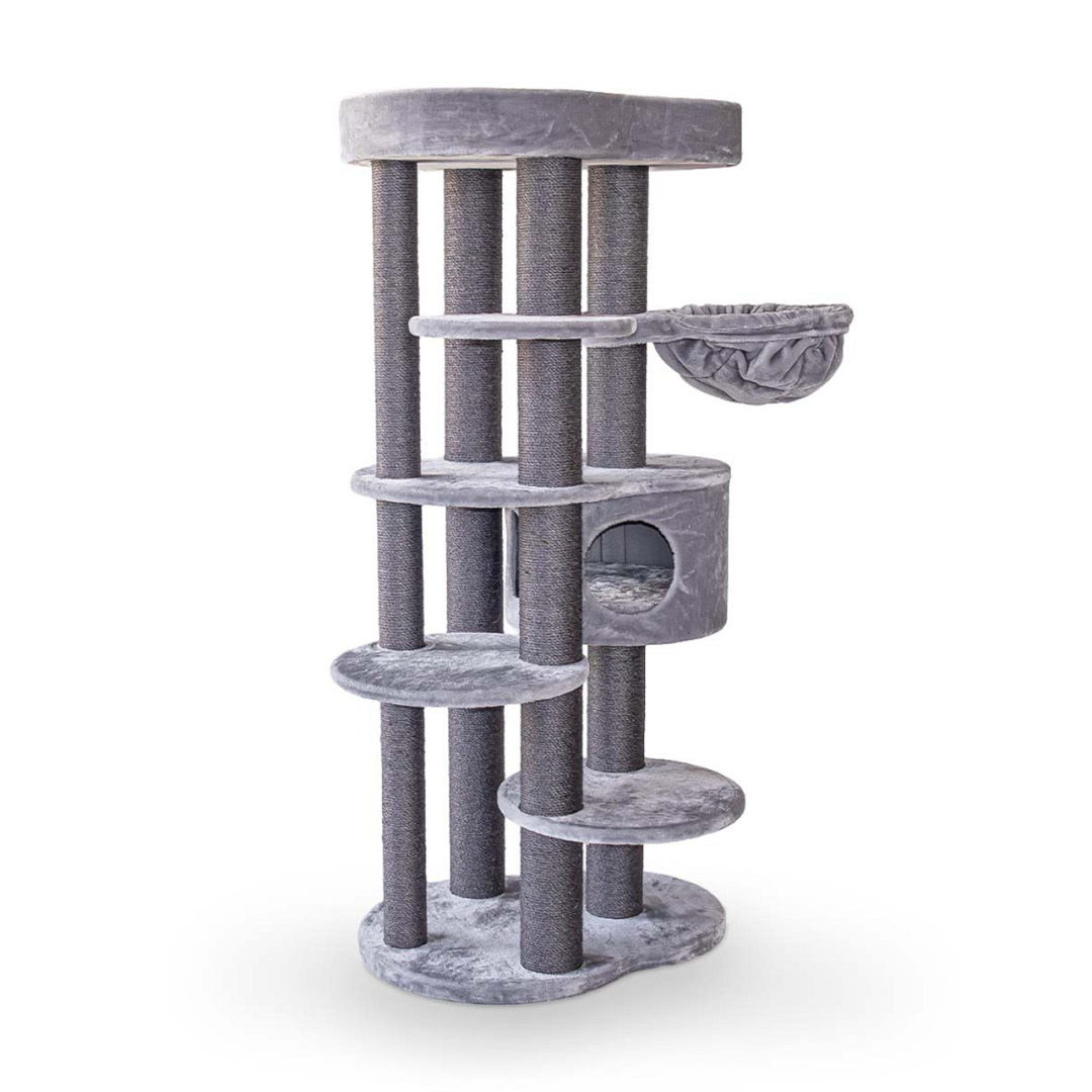 Royale krabpaal met dikke krabstammen, meerdere plateaus, een zachte hangmand, een knus kattenhuisje en bovenin een extra grote loungemand. Afm. 93 x 75 x 170 cm.